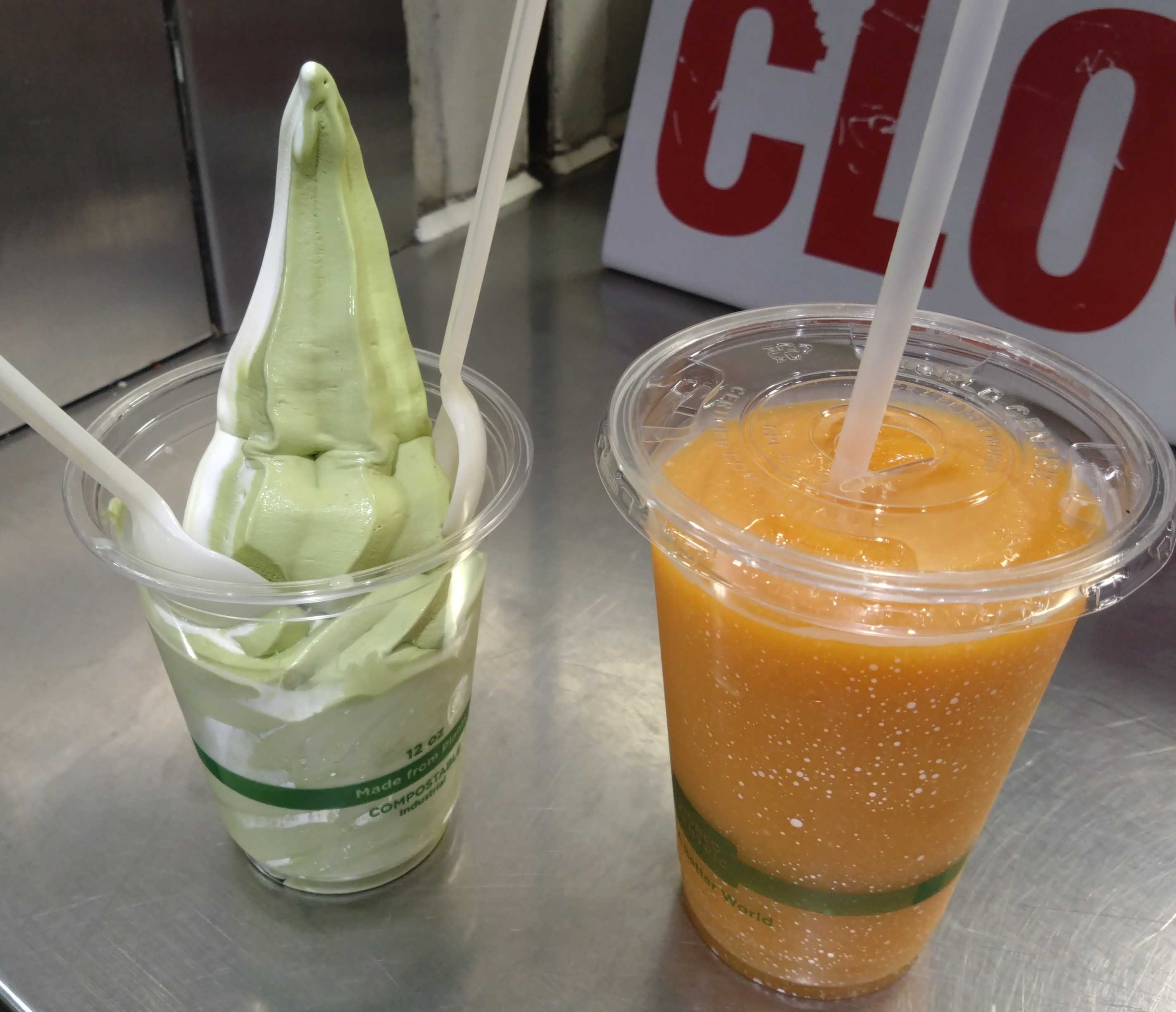 2025.7月購入北海道ソフトクリーム宇治抹茶 ミックスお値段:¥300✰⋆。:゚・*☽:゚・⋆。✰⋆。:゚・*☽:゚・⋆。ほろ苦で美味しい。(右はメロンスムージー)