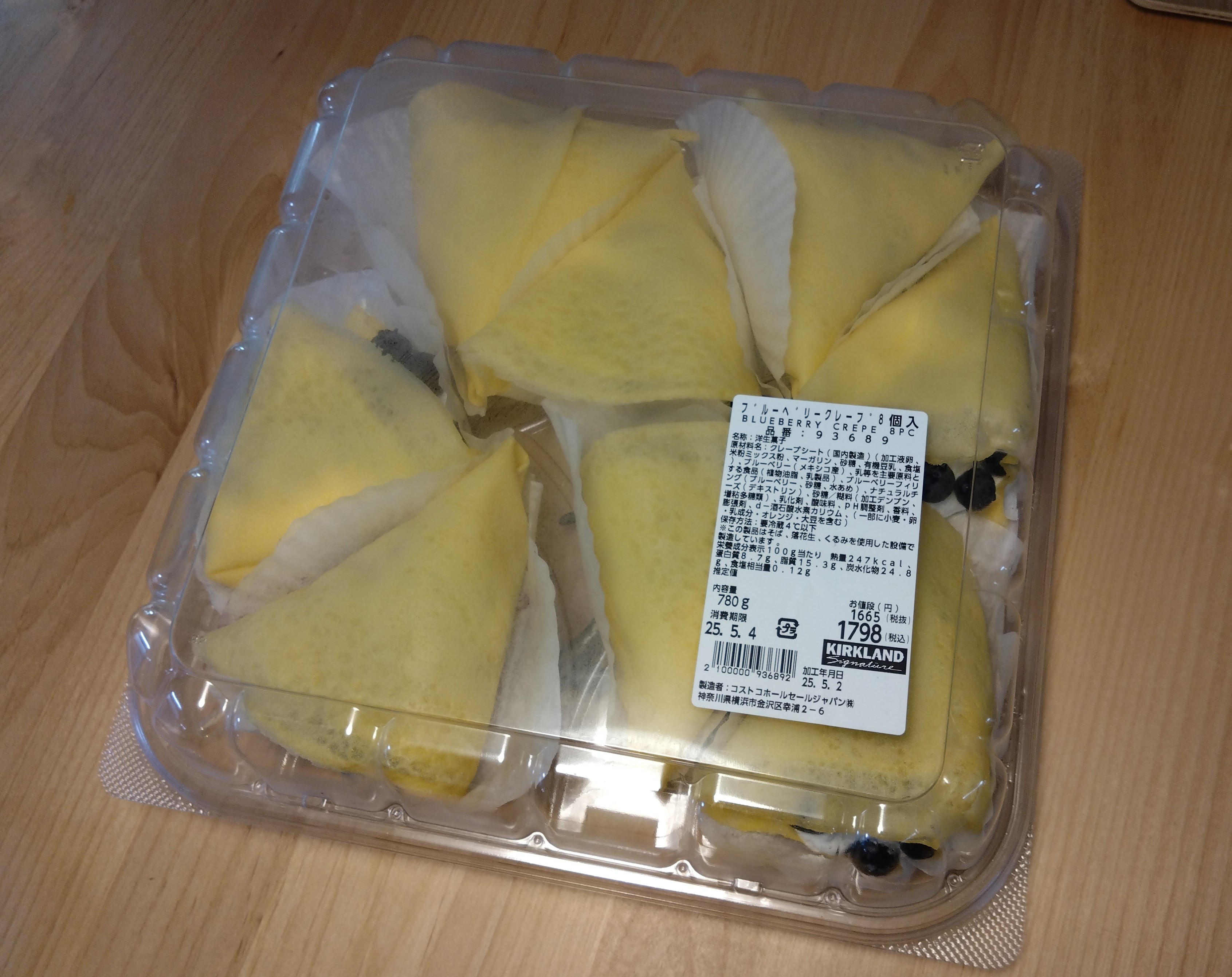 2025.3月購入ブルーベリークレープ 8個入りお値段:¥1798✰⋆。:゚・*☽:゚・⋆。✰⋆。:゚・*☽:゚・⋆。マスカルポーネ入りのホイップクリームがたっぷり。メキシコ産の大粒ブルーベリーもポコポコと沢山入っています。クリームはこってりだけど甘酸っぱいブルーベリーと一緒に食べると美味しかったです✨一個食べたらかなり満足。