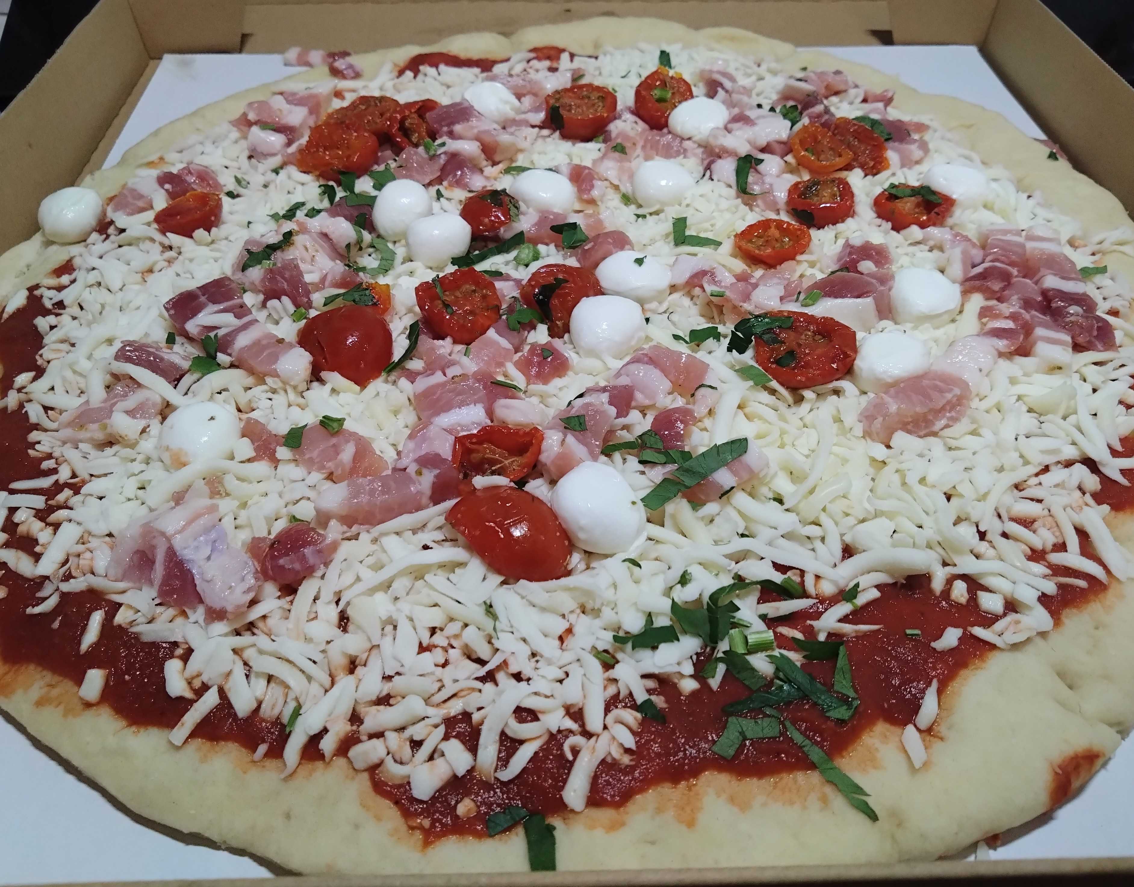 2025.5月購入丸形ピザ パンチェッタ&モッツアレラお値段:¥1980✰⋆。:゚・*☽:゚・⋆。✰⋆。:゚・*☽:゚・⋆。タイムセール?だったみたいで1580円で購入できました♪パンチェッタがたっぷりなので塩味濃いめです。我が家のオーブン、一般的なレンジと一体型のものですが、半分にカットしないと入りません(ㆁωㆁ)