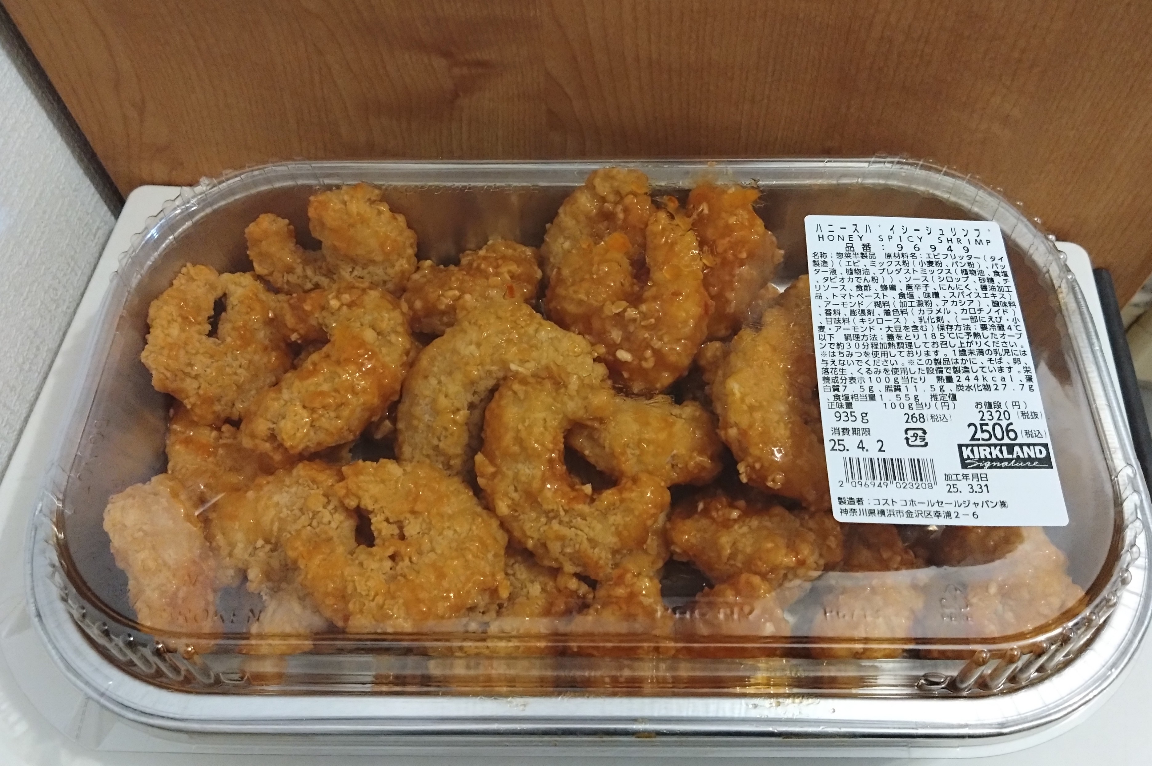 2025.3月購入ハニースパイシーシュリンプお値段:¥2506100g当たり¥268✰⋆。:゚・*☽:゚・⋆。✰⋆。:゚・*☽:゚・⋆。《調理方法》蓋を取り185℃に予熱したオーブンで約30分程加熱調理してお召し上がり下さい。書かれている通りにオーブンで焼いてみました!エビは揚げ済のものだと思いますがオーブンで焼いたら加熱前より若干エビが縮んだ気がしますwでも、衣もしっかり付いてるけど中身も結構立派なエビだと思います。パン粉が混ざった衣なので、エビフライとフリッターの中間みたいな感じ…?スパイスが効いてるわけではなく、スイートチリソースですね。辛いの苦手な人にはちょっと辛いかも。アーモンドクラッシュが混ざっててアクセントになってそこは美味しい。1日目は2/3程をオーブンで焼いて食べましたが2日目は残りをレンジで軽く温めてからトースターで焼いてみましたが問題なく食べられました(多分)