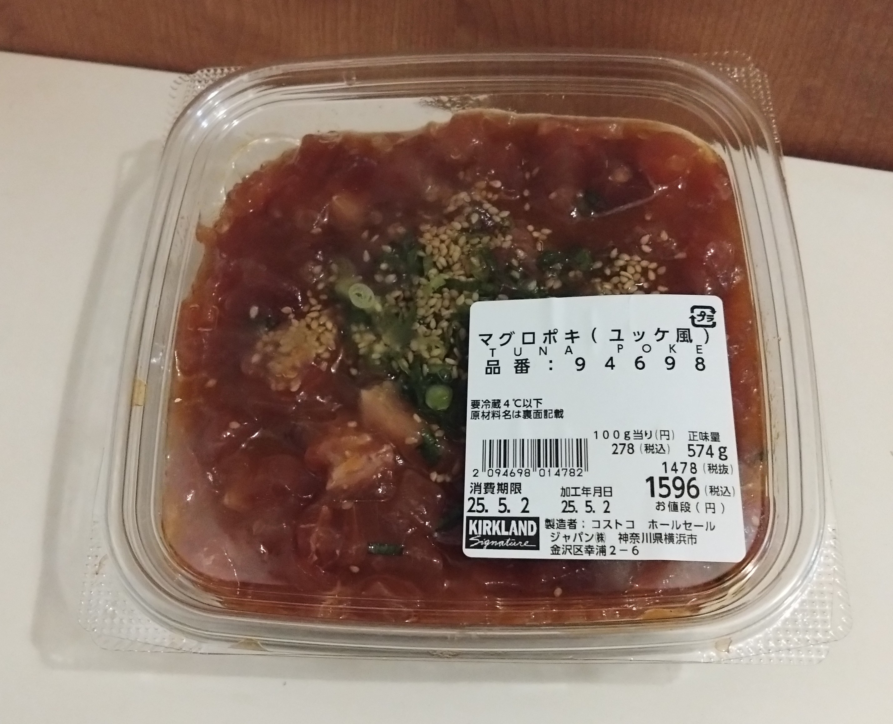 2025.5月購入マグロポキ(ユッケ風)お値段:¥1596100g当たり∶¥278✰⋆。:゚・*☽:゚・⋆。✰⋆。:゚・*☽:゚・⋆。通常だと¥378なのかな??「今日はお安くなってまーす!」と店員さんが呼び込みしていて試食を食べたら美味しかったので購入。ごま油と醤油とコチュジャンのちょっと甘めのユッケ味。マグロは何でこんなに小さくカットしてるんだろ?と思うサイズでしたが、ご飯の上に乗っけて食べたら美味しかったです😋