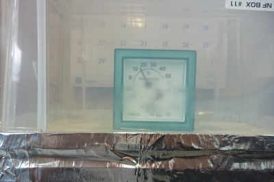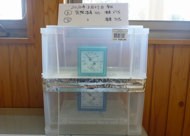 お待たせ忘れていた訳ではありません湿気取る方の箱の準備に時間かけてました45%から26%まで湿気取りだけで抜けてしまいました(゚ー゚;Aすでにこの時点で「ビニルクロス」は水蒸気(湿気)を通すと解った訳ですまぁ湿気取り2個使いなんですが冷蔵庫で冷却することで空気内の水蒸気を早く「水」にしてやろうとしたのですが普通に外に放置してました(パック詰めした時より最近は寒いので)こげんぱさんのアドバイスにより、石膏ボードもサンドイッチ!室内(相対湿度高い)→クロス→石膏ボード→屋外側が本来だけどクロスをコーキングでパックしてしまったので、本来とは逆で湿気の多い部屋→ボード→クロス→乾燥室というイレギュラーな実験になりましたクロス用糊もありませんが、まぁ良いとしましょうこの間に断熱材はありませんが、これが「外張り断熱」の外周部内壁を同じになります要するに、「気密シート貼ってませんよ」って事色んなブログ見ると「クロスは水蒸気通さない」って言い切っちゃってる人沢山居ますねーさぁ、今のうちに訂正しておいた方がいいですよ~ヒヒヒ条件の違う部屋同士はコーキングしてから透湿抵抗バリバリのアルミテープで目張りしました現在の状態 外気温11℃ 温度計11℃(ガレージ日陰で保存してました)(事務所18℃ですが、温度計のタイムラグです)湿度 上の箱 26% 下70.2%(水入り)今度は下の箱に入った水を水蒸気にしてやる速度を速める為に暖めます(窓際に放置)高い方から低い方へ多い方から少ない方へ防湿層はきちんと施工しましょう←このコメントはまだ早いか(笑)