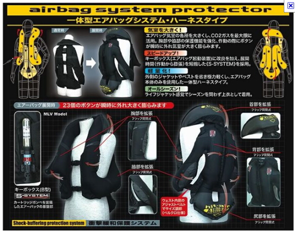 最近暇無くてバイクに乗ってませんが( ̄_ ̄ i)、ツーリングのベストシーズンに入るので機会があれば乗ってやろうと思う毎日無茶な運転しないし、ヘルメットもフルフェイス。プロテクター入り(胸部・背中・肩・肘)のジャケットに膝・スネパッド入りのパンツ。そしてライディングブーツという重装備でもね、正直まだ不安・・だったら乗るなよ、って話だけど趣味だからねそう簡単にはやめられません(>д<)前々から気になってたオートバイ用「エアバッグジャケット」HitAirYoutubeなんかにも実際のデモ動画があって、これは欲しいなって思ってましたただ、ジャケットって季節物なので少なくとも2種類は要るから、とんでもない金額になっちゃうそこで待ってました!なこの商品「HitAir・ハーネスタイプMLV」という商品バイクに付けたフックにワイヤーをエアボンベに繋いでおき、瞬間的に規定の引張力が掛かるとエアバッグが作動。0.25秒で全展開するので相手の車や地面に接地する前に身体をエアバッグで包んでくれますまだ隼にワイヤー付けてないので、室内で着用しハニーが撮影(笑)お気に入りのBATESのジャケットの上に着てみました1.1kgなのでそんなに重く感じません。ボンベがある右側だけが重いのが気になりますけど万が一事故に遭って怪我。手や足なら放っておけば治るしかし内蔵、頚椎はそうはいかない安全運転してても相手があるから起こる事故せめて「死なない」為に買いましたこれからも無事故・無違反・無転倒で楽しみたいですこのまま冬眠しちゃうかも、な隼ちゃん(┬┬_┬┬)