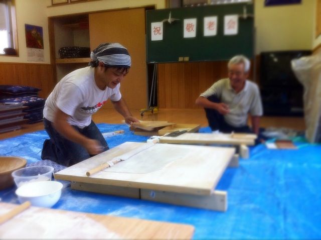 自治会の敬老会がありました親父がそばを打って振る舞うとは聞いていたのですが、6Kg!と聞き僕もピンチヒッターで参加朝8時に公民館に行き、早速仕込み開始自宅で食べる時は10割なんだけど、お昼まで時間もあるし蕎麦が切れてしまうので2-8蕎麦にするとの事そば打ちが趣味というおばさんと、親父と僕の3人で作業開始ウスで一度に練る蕎麦は1Kgなので、合計6回。500g分けて打つので12回・・・たぶん一番体力的にはスタミナあるであろう僕が6回打ちました汗が蕎麦に入らないように気をつけながら時間勝負2割小麦粉が入るだけでいつもと感触が違うので困りましたが、何とか切れずに打ち終えました周りに居るお年寄りや自治会の役員さんは、僕のお客さんが多いので皆知り合いばかりこの公民館も建築させて貰ったりしてるので会話も弾みます2時間弱のお手伝いを終え、後は親父に任せて家に帰りましたが皆美味いって言ってたぞって後から聞いて嬉しくなりました役に立てて良かった来月もこのくらい打ってキャンプ場に行くんだよね~FSとかJBとか言う人も行くらしい・・・ハテサテ?
