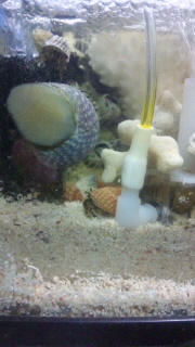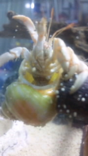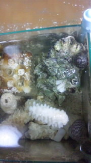 こんばんは~ 寒い彡(-_-;)彡 というか雨が冷たい(≧ω≦) 自転車通学には辛いです 手に雨が… 水槽の海水プール 見る度に、イシダタミは逃げているので、 見る度に、戻す毎日w 昨日、海ヤドを見ていると 一匹がもう一匹を攻撃というか、ちょっかいとか、 貝を替えたそう(?)なそぶりを見せていたので、 随分と前にタカシェルさん所で買った貝のセットの中の凄い小さい貝を入れました すると… 次の日、だから今日か… 一匹宿替えしてました~ これで見分けが付くようになったw ヤドも貝も元気みたいです 今日はワカメ入れときました 食べるかなぁ~? では ※画像のほぼ真ん中の赤っぽい貝を着てる子が宿替えした子です