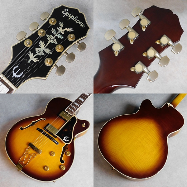 ◆エピフォンロゴやヘッドインレイ、ゴールドパーツ、ボディ両面や指板、ヘッドにカスタムバインディングなどゴージャスさを演出。