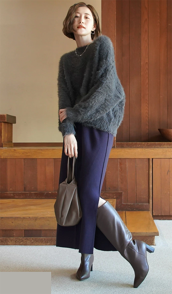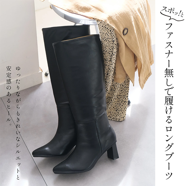 ▶ ファスナー無しでスポッと履けるロングブーツ。ゆったりながらもキレイなシルエット。