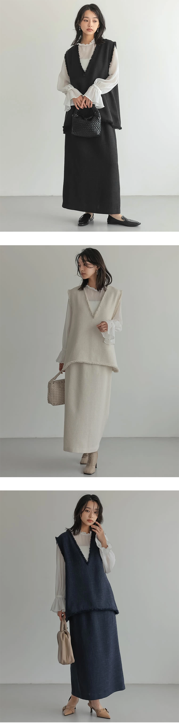 • 裾にはスリットデザインを施し、足さばきも◎同素材のツイードライクフリンジVネックベスト