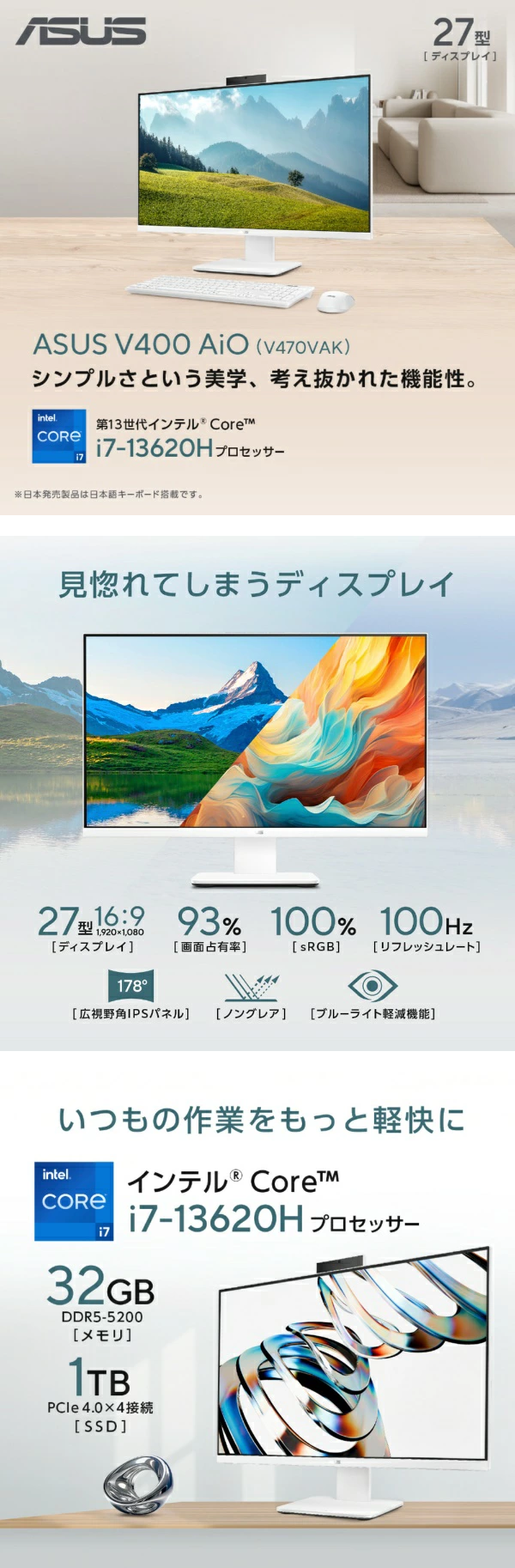 ▶ 楽天市場のサイト: 新品 デスクトップパソコン PC 一体27型 ASUS V400 AiO V470VAK 13世代 Intel Core i7-13620H Windows11