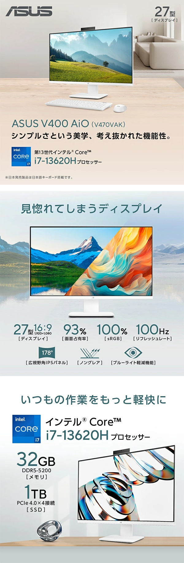 ▶ 楽天市場のサイト: 新品 デスクトップパソコン PC 一体型 ASUS V400 AiO V470VAK-WPE092W 13世代 Core i7-13620H モニター 27型