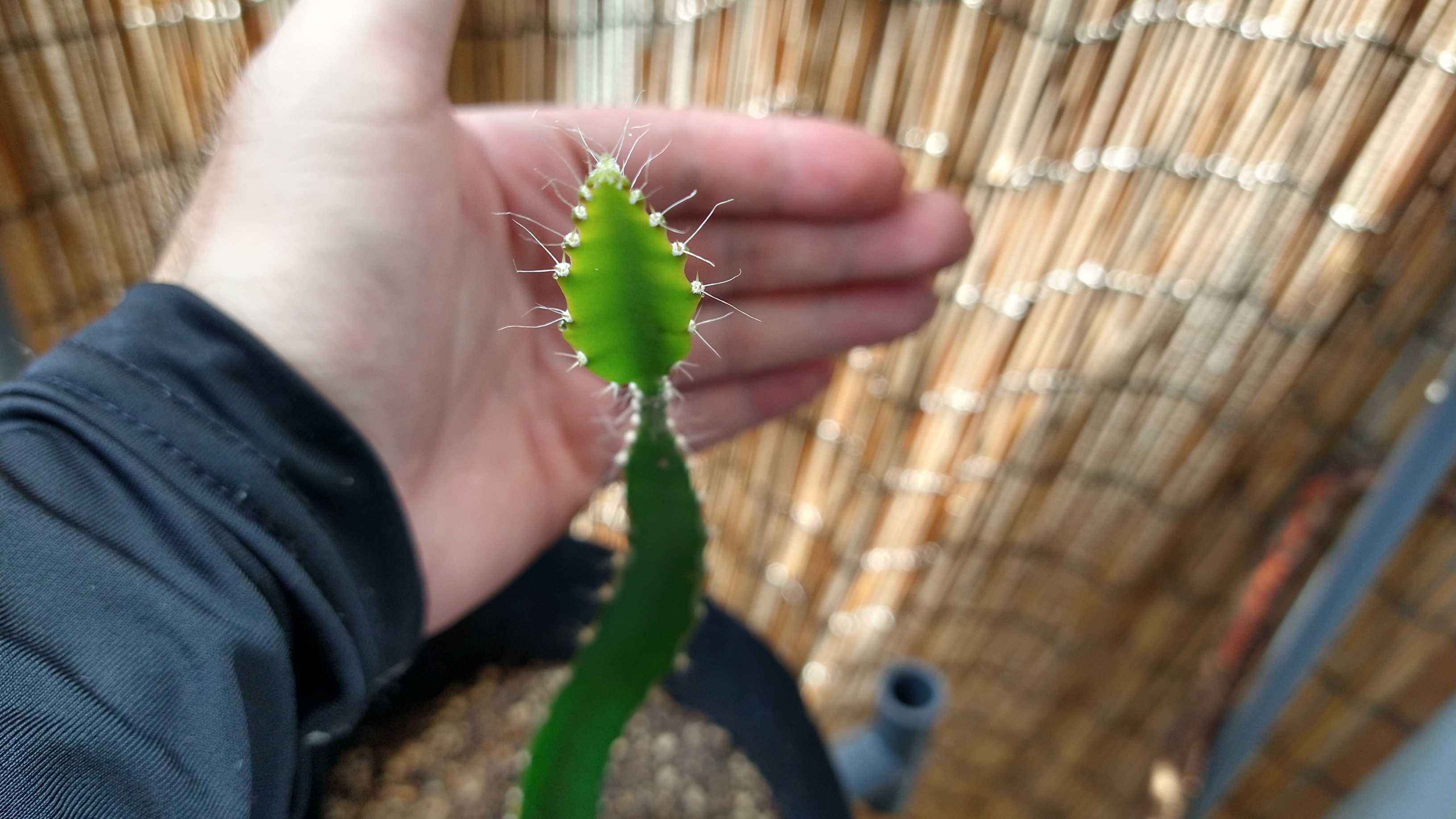 サボテンの一種なだけあってドラゴンフルーツの成長は遅い。水も毎日与えるわけじゃないのでじっくりと観察したりしないんですよね、あんまりと。そんなドラゴンフルーツを久しぶりに変わりないかよく見てみた所、先っぽが伸びてた。だけどなー、花のつぼみが出来たわけじゃなく、ただ単に伸びてるだけなんだよなー。本来のドラゴンフルーツは、わっさーといっぱい伸びてるイメージなんで本来はたくさん伸ばした方が良い気もするんだけど、見てしまったんよ。何が?って言うと、海外のドラゴンフルーツの生産者?的なインスタをさ。本来わっさーと伸びてるドラゴンフルーツのイメージを覆す育て方かは分からないけど、こうやって一本のドラゴンフルーツを剪定?してかは分からないけど、一本から実が成ってるのを見ちゃったんだよね。という事で、今現在はアレを目指してるのよ。なので・・・伸びた部分を取っちゃいました。これってとる分には特に問題は無いみたいなんだけど、花が生えるタイミング的な物ってよく分からないみたいなんだよね。色んなドラゴンフルーツの育て方のサイトを見てもよく分からないみたいなのよ。ドラゴンフルーツってちょっとやそっとじゃ枯れないみたいなんで、気長に花が出来るのを楽しみに育てていこうと思います。