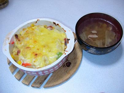 今日の、連合音楽会とてもすばらしかった・・・・・息子達と同じ、小4の子供・・・・そして、小3の子供皆どの学校も、素晴らしい・・・・ブラボ~~~息子達も、この間の、学校で開かれた、学習発表会の時より、何倍も素晴らしいものに・・・・本当に、涙してしまいました!!素敵な、歌声、音色にね・・・・・そして、久々に、学童時代の役員仲間で、ランチもしちゃいました!!くるくるでxxxxそして、本日の、お待ちかね、夕食!!『残り野菜グラタン』『キャベツ・ベーコンのコンソメスープ』なかなか、よろしくて・・・・・息子と一緒に、冷蔵庫の中のもの(ウィンナー・ベーコン・チーズ・コーン)巻いて巻いて、切って出来た、明日の朝食パン!!でも何故か、今日のは、焼き色がxxxxxなんででしょうね??明日は、『カンフー』・・・・息子は、ガンバリマス!!あたしは、見てるだけ・・・・・・