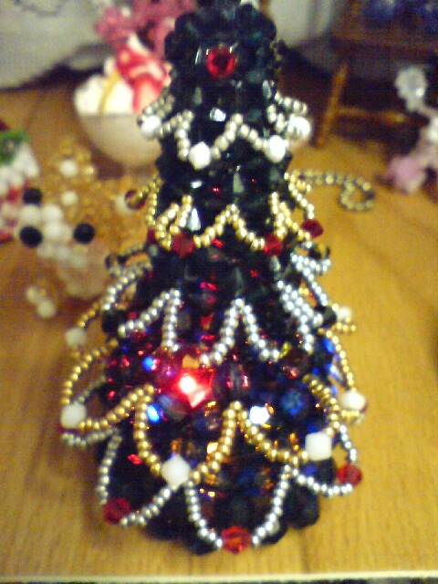 出来上がりました LEDでピカピカ光るツリーアクリルビーズだけでも約200個は使うので ビーズの作品としては大作ですきれいですよ 部屋を暗くして見るとムード満天