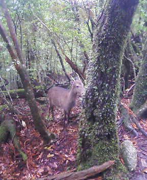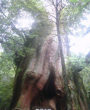 DAY4 17th, May(続き)雨にも負けず、風にも負けず昔林業で使われていた(今も使われている)トッロコ道沿いをドンドン歩いていく。閉鎖された学校跡地を過ぎ、照葉樹林をすぎ、防空壕あとを通り抜け、川を何度も渡りウィルソン株に到着。これはかつてウィルソンというおっさんが見つけた巨大な切り株。ライブドアなんて名前のおっさんに見つけられんで良かったなあ暴落するところやったで。切り株の中は空洞になって13畳もの広さがある。うちより広いやんけ!さらにそこには滅茶苦茶美味しい水も沸いている。至れり尽くせりやな!!更にそこから進んで大王杉(樹齢3,000歳?)をすぎ夫婦杉(2本の杉が枝で合体している)へ。繋がっている一本の枝を見て、夫が妻の肩に手を置いているみたいと言ったおねーさんがいたが、俺には妻が夫の耳を引っ張って「アンタ、また無駄使いして!」と怒られている様に見える。ま、いっか。奥に進むとヤクシカ発見。人をまるでびびらない、教育の必要アリ。 この場を借りて言っときますが野生動物にエサを与えてはいけません動物が人間をなめて襲ったり、生態系を壊すことになります。人間の子供ももちろん野生動物なので、お菓子などを与えてはいけません。12時前に縄文杉到着。上手い具合に雨が上がった。意外と驚きや感動が少なかった。ここに来る以前にもかなりデカイ樹を観て来たせいかな。地元の人間にもやはり縄文杉はそれほど高い評価は受けていない。ま、ホンマにでかいし一見の価値はありますよ。樹高25.3m、胸高周囲16.4m、推定樹齢2,600~7,200年現在確認されている中で最大の屋久杉その複雑な樹面から縄文杉と命名樹もすごいがそれを支えてる大地もすごいなー。年間1万人以上もの観光客が訪れているそうなのでもっとアホみたいに人が群がっているかと思ったが雨のせいかそれほど人はいなかった。杉にの根を踏んで傷めないように、展望所と柵が作られている。縄文杉で野生化 かなり手前に俺がいるだけで杉は見た目もっとでかいです。しっかしいい体してるな俺。胸筋は影を作ってるし、腹筋は割れてるし肩の肉の付き方が美しい。コイツになら抱かせてもいいと思うわ。(誰を?)