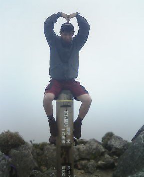 DAY4 17th, May(続き)縄文杉の少し先までいくと高塚小屋という山小屋がある、「目茶苦茶きたない」という噂やったけど、ブロックつくりで壁が汚くなんとなく陰湿な感じやけど、中が汚れているというわけではなかった。更に1時間ほど歩いて無人、無料、勝手に泊まっていい新高塚小屋に到着。こちらは大分ましな感じ。6時半に出発して13時すぎに到着か、結構早い方かな途中ほかの人を抜かすことはあっても、抜かれることはなかった。陽が出てきたので濡れたもの全てを干して食事にする。グチュグチュの靴が気持ちわるい!昼寝をしていたらまた雨が降ってきたので洗濯物を片付ける。やっぱし台風のせいか、夜になっても小屋は3人しかいなかった真っ暗でやることもないので8時ごろにまた寝る、腹が減ってパンを食べるそしてまた寝る。普段より睡眠時間多い。 DAY 5 18th, May服は全部乾いた、靴は濡れてるがまあしゃあない。朝飯を食べ、昨日と同じ6時半出発・・・・小屋を出てすぐヤクザル発見(ガラの悪い名前や)んん? 10匹以上おる、ヤクジカも5匹以上はおる俺の行こうとする方向で固まってるしかも全員俺にメンチ切ってる(関東ではガンとばすって言うんでしょうか?)人気者やな俺、熱い視線を浴びてしまってビビル。一斉にこいつらが襲ってきたら勝てるか?俺?そういえば本で読んだぞ、猿は相手を威嚇するのにキンタマを見せるらしい。弱点を攻撃される恐れもあるがこのままでは道を明けてくれん猿と人間の違いをみせたるかデカイほうが勝つ!ズボンに手をかけた瞬間、俺の殺気にびびったかヤクザルが目線をそらした。この戦もらった!オラオラオラな態度でこっちから近づいていくと奴らは逃げ出した。さあ、登山開始。ええ天気やなあ 雲の海が下界にひろがってるぞここで定番の名言を一つみろ人がゴミのようだ 必死で登る高度1,700mをすぎると山の様子がまるで変わってくる。それまでは樹の海だったがここでは草の丘に白い枯在木が所々に見える。椿、サクラツツジ、ヤクシマミヤマスミレ、サツキ、テッポウユリ、石楠花(しゃくなげ)このシーズンは雨が多いが花は綺麗。目指す宮之浦岳以外にも色々山があるんやけど大体がてっぺんはデカイ岩になっているし、中腹もまるで抹茶アイスに胡麻をふったみたいに巨岩が点在する。巨神兵みたいな岩も発見。また段々天気が悪くなってきた。 天辺までもうすこしか?出発から3時間、ついに宮之浦岳のてっぺんに到着。風が強くて少し寒い。九州より更に南にあるこの島で、ここでは冬に積雪が3mにもなるという。 この瞬間、俺は九州で一番高い男楽しみにしていた上からの眺め、雲で見えず。まあ、降ってないだけラッキーか。昨日山小屋であった人は雨がひどくて5分もここにいられなかったらしい。しばらくのんびりしてたら次々反対のルートから登山者がやって来た。なぜか関西人多し。続く