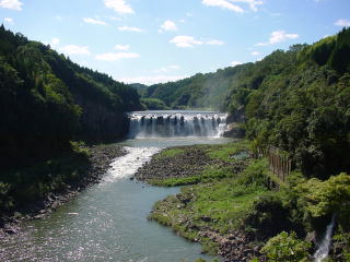 この滝、遠くから眺めているのに飛沫が写真で見えるぐらい。近くの原尻の滝が観光地化されてしまって写真を撮りにくくなって来ていた。それと釣り橋を無意味に揺らして遊ぶ人も増えて来たので違う景勝地を探していただけにヽ(^。^)ノバンザイでも、この滝は古くから西日本の雄瀑として知られているらしく、雪舟が「鎮田瀑」として風景図や1575年にこの滝を見た前関白近衛竜山公が歌を残している。 近年は上流にダムがある為に、増水時にしか轟々と飛沫は見れないそうですが....それだけの価値はありました。