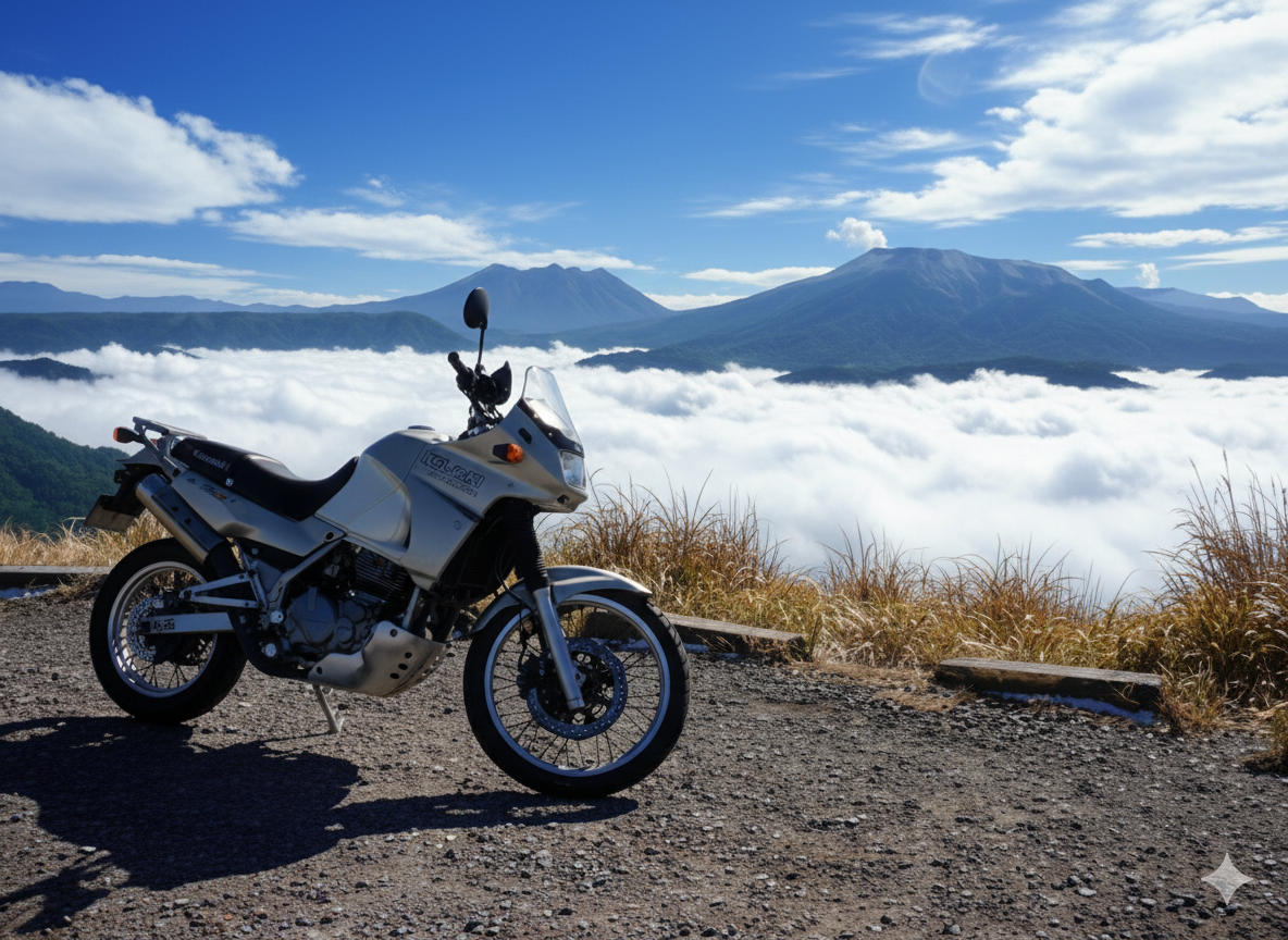 にゃふふ〜、今日の目的地は、ライダーにゃんこたちの憧れの地、阿蘇にゃのよ〜。特に晩秋のこの季節は、空気が澄んでて、景色がキラキラしてて、にゃんとも言えにゃい美しさに包まれるにゃ。そんな絶景を求めて、にゃんこは朝のまだ暗いうちから、愛車にまたがってビューンと走り出したにゃ。30年前も、雲海の写真を撮りたくて、週末になるたびに阿蘇へ向かって走ってたにゃんて、にゃんこライフの原点がここにあるにゃ〜。◇-------◇-------◇-------◇-------◇-------◇でもにゃ、この日の朝はちょっぴりしょんぼりな空模様。ヘルメットのシールドに雨粒がぴちぴち跳ねて、にゃんこのおひげも湿っちゃうくらい。心の中では「今日の絶景は見られにゃいかもにゃ…」って、ちょっぴり不安になりながらも、外輪山のてっぺんを目指して、にゃんこエンジン全開で走り続けたにゃ。冷たい雨風に負けず、ただただ前を見て、希望を胸に進んだにゃ〜。※画像はAIによる生成(Gemini使用)そしてにゃ、ついに外輪山の頂上に到着したその瞬間、にゃんこの心配は見事に裏切られたにゃ。目の前に広がっていたのは、まるで夢の中のような光景にゃん。眼下には、ふわふわもこもこの「綿飴の湖」が広がっていて、雨でしっとりした空気が盆地を埋め尽くして、濃厚な雲海が静かに波打ってたにゃ。そこだけ時間が止まったみたいで、にゃんこは寒さも疲れもぽんっと吹き飛んだにゃ〜。※パノラマ阿蘇五岳の雄大な姿も、雲海の中にぽっかりと浮かび上がっていて、まるで「阿蘇の涅槃像」が白いおふとんをかけて、すやすやとお昼寝してるみたいだったにゃ。にゃんとも神秘的で、にゃんこはしばらくぽけ〜っと見とれて、心がふわふわと空に浮かんでいくような気分だったにゃよ。そしてにゃ、お昼が近づくにつれて、太陽のぽかぽか光が雲海を照らし始めると、綿飴のような雲たちがゆっくりと空へと昇っていって、まるで空に溶けていくみたいにゃ〜。やがて雲海がすっかり消えると、その下からは、阿蘇の田園風景がパッチワークみたいに広がって、のどかで優しい日常の景色が顔を出したにゃ。幻想的な絶景から、ほっこりする牧歌的な風景への変化、これは早起きして走ったライダーにゃんこだけのごほうびにゃ。ちなみににゃ、阿蘇外輪山のこの絶景ポイントは「大観峰」って呼ばれてるにゃ。でもにゃんこたちの間では、あまりの眺めの良さに、親しみを込めて「大観望」って呼ばれてるにゃ。にゃんこもその気持ち、よ〜くわかるにゃ。だって、あの景色を見たら、誰だって感動して、つい名前を呼びたくなっちゃうにゃもん。今回の雲海体験は、雨にも負けず、風にも負けず、バイクで走ったからこそ出会えた、にゃんこ的奇跡の瞬間だったにゃ。ライダーにゃんこたち、晩秋の阿蘇の雲海、ぜひ狙ってみてにゃ。早起きして走る価値、あるにゃあるにゃ〜。にゃんこ保証付きにゃ。