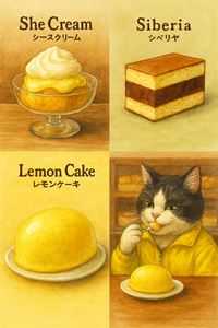 ◆シースクリーム(シースケーキ)にゃ♪福岡・長崎を中心に愛されてきた、昭和生まれのご当地スイーツにゃんこ。 ふわふわのスポンジケーキの上に、カスタードクリームとホイップクリームがたっぷりのって、 その上に彩り豊かなフルーツがちょこんと飾られてるにゃ〜♡ 黄桃、パイン、さくらんぼ…見た目も華やかで、まるでケーキの上に小さな宝石箱が広がってるみたいにゃ。 冷蔵ケースでキラキラ輝く姿に、にゃんこ思わず足を止めちゃうにゃん。◆シベリヤにゃ♪ カステラと羊羹の異色コンビが織りなす、和洋折衷の不思議スイーツにゃんこ。 ふんわり甘いカステラの間に、しっかりとした食感のこしあん羊羹がサンドされてて、見た目はまるでお菓子の断面アートにゃ! 明治〜昭和初期にかけて人気を博したこのお菓子、最近またじわじわと復活してるにゃんよ。 「シベリヤ」という名前の由来には諸説あるけど、寒い地方のイメージや、断面の色合いが雪景色に似てるからとも言われてるにゃ。 懐かしさと新鮮さが同居する、にゃんとも不思議な魅力のスイーツにゃんこ♪◆レモンケーキにゃ♪ 黄色いレモン型のフォルムに、つやつやのレモングレーズがかかった、昭和の定番スイーツにゃんこ。 袋を開けた瞬間、ふわ〜っと広がる爽やかな香りに、にゃんこ思わず深呼吸しちゃうにゃ♪ 中はしっとりふわふわのスポンジで、レモンの酸味と甘みが絶妙なバランスにゃ。 昔ながらの製法で作られたものから、最近は国産レモンや無添加素材にこだわったものも増えてて、 懐かしさと安心感がぎゅっと詰まった、にゃんこ心をくすぐるスイーツにゃんよ。 おやつにも、ちょっとした贈り物にもぴったりにゃ♡