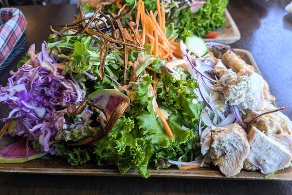 今日はごきげんな一日にゃんで、さあ、どこへ行く?と宗像方面にプチドライブ海がきらきら、さつき松原のすぐそばにゃ。秘密の入り口みたいな場所にある、それが「ムナカタキッチン」にゃ。お腹が「グルニャー、グルニャー」って、もう大合唱。ワクワクしっぽを振って、急いでお店に飛び込んだにゃん。今日のお目当ては、悩んだ挙句に「日替わり定食」運ばれてきた瞬間、もう目がクギづけ!お耳はピーン!って立ったにゃん!お皿の上で、たーっぷり!うずたかく盛られた、新鮮なお野菜の山にゃ!わーい!わーいにゃ!これぞお野菜のカーニバル、デラックスにゃん!ただの定食じゃないにゃん。お野菜たちが「さあ、私を食べてにゃ!」って、元気いっぱいに誘ってくるにゃんよ。リズムに乗って、まずはシャキシャキの葉っぱさんから!緑の葉っぱさん!シャキシャキ、パリパリ、まるで鈴の音だにゃん!一口食べるたび、「あ、いい子いい子!」って、頭を撫でたくなる食感だにゃん。濃い緑、薄い緑、みんな太陽をいっぱい浴びたね。口に入れると、みずみずしいお水がジュワー体がきれいになる、デトックスだにゃん。 気分はもう、軽やか!※木製トレー一杯の野菜と、右隅のメインディッシュ次に、太陽の色たち!オレンジ、イエロー! 人参さんみんな明るい太陽そのものみたいに、きらきら輝いているにゃんよ。人参はシャキッと、食感が違うから、飽きずにどんどん食べられるにゃ!元気チャージの魔法の粉、入ってるにゃん!一日の疲れが、キラキラの光で吹き飛んじゃうにゃん!葉野菜のちょっとした苦みが、他の派手な野菜さんたちの味をギュッと引き締めてくれる。みんな手をつないで、ひとつのハーモニーを奏でているにゃ!まさに、最高のチームワークにゃん!にゃー、すごい感動だにゃ。 愛情たっぷり、新鮮お野菜。こんなにたくさん食べられるなんて、ムナカタキッチンは、きらきらにゃんこの楽園だにゃんね!夢中になって「むしゃ、むしゃ、むしゃ」!一気に食べ進めていたにゃん!アゴが疲れるなんて、全然気にしない!だって、あまりに美味しくて、早く次が欲しかったんだもん。目の前に最高級の魚の缶詰があるときと、同じくらい真剣勝負だったにゃんよ!さあ、忘れてはいけないのが、今日のメイン、「鳥の...」!そう、チキンさんにゃ。チキンさんは、お野菜のきらめきに負けない、優しいオーラを放っていたにゃん。一口パクリと食べたら、「にゃ、にゃあー!」って、感嘆の声!野菜の量に負けて、思い出せないにゃん。しっぽをぶんぶん振って、頭をフル回転!でも、だめだにゃ、出てこない!でもね、名前は忘れちゃっても、この感動の食感は体が覚えているにゃんよ。全部きれいに食べ終わって、お皿はピカピカ!お腹も心もホッカホカだにゃん!背伸びをして「ふー、にゃんとも満足にゃ!」って、大きなあくびが出ちゃったにゃん!こんなに元気をもらえるランチは、他にはないにゃん。さつき松原の素敵な自然のエネルギーと、ムナカタキッチンさんの愛情が、ギュギュッと詰まった日替わり定食だったにゃんよ!またすぐに、このきらきらお野菜のダンスと、とろけるチキンさんに会いに、ムナカタキッチンへ行くにゃん。#ムナカタキッチン #宗像 #さつき松原 #猫舌グルメ #日替わり定食 #野菜ダンス #福岡ランチ