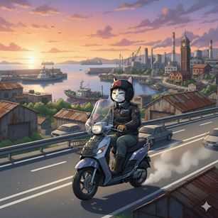 2009年8月お盆のお話.....◇-----------◇-----------◇-----------◇前日のロングツーリングでお尻が悲鳴をあげてたってのに、今朝も懲りずにアドレスで近所をひとっ走りしてきたにゃ。これがまた、たまらんのよにゃ〜。この季節の朝の空気って、まるで猫じゃらしみたいに心をくすぐってくるんだにゃ。何も考えずに、ただただ風を切って走るだけ。※画像はAIによる生成(Copilot使用)それだけで、にゃんとも言えない幸せが胸いっぱいに広がるんだにゃ〜。でもにゃ、あまりに無心で走ったもんだから、行き道の記憶しか残ってにゃいのよ。帰り道?にゃんかもう、夢の中だったかもしれんにゃ。でもでもにゃ、そんなことは気にせず、今日も熱血レポートをお届けするにゃ!さてさて、昨日の話にゃ。☆彡☆彡☆彡☆彡☆彡☆彡☆彡☆彡☆彡☆彡☆彡☆彡☆彡☆彡☆彡☆彡☆彡☆彡☆彡☆彡AM4時、まだ夜明け前の暗闇の中、おいらは愛機DRにまたがって出発したにゃ。エンジンの鼓動が静寂を切り裂いて、まるで夜の森を駆ける黒猫みたいに、しゅばばばっと走り出したんだにゃ。椎田バイパスのあたりを抜けてると、道沿いの池に空の色が映ってて、水平線の向こうから太陽が顔を出そうとしてるのが見えたにゃ。※画像はAIによる生成(Copilot使用)その光景は、まさに神々しいってやつで、早起きして走った者だけが味わえる特権にゃ。思わず「にゃああああ!」って叫びたくなるほどの感動だったにゃ。その感動を胸に、以前見つけた裏道を通って、寒さに震えながら宇佐から玖珠へと向かったにゃ。山の斜面にそびえ立つ高架を走るとき、眼下に広がる山々の景色が、まるで猫の目に映る宝石みたいにキラキラしてたにゃ。※画像はAIによる生成(Copilot使用)途中で耶馬渓の奇岩を見つけたり、バイクを停めて写真を撮りたくなるような池を発見したり、道そのものがまるでにゃんこの遊び場みたいだったにゃ。玖珠の街で最初の給油を済ませてからは、懐かしの四色彩道路へにゃ。九重“夢”大吊橋ができてから観光客が増えて近寄らなくなってたけど、久しぶりに走ってみたらやっぱり最高だったにゃ!バイク乗りにとって特別な道ってのは、何度走っても心が躍るにゃ。長者原には出ずに、筋湯から瀬の本へと抜けるルートを選んだんだけど、これがまた面白かったにゃ。スキー場付近では、まるで雲の中に突っ込んでるような感覚で、雲の粒が舞台に当たって雨になってるって感じだったにゃ。おいらのバイクもじっとりと濡れていったけど、それすらも旅の味ってもんにゃ。※画像はAIによる生成(Copilot使用)瀬の本からは、ライダーの憧れの道、ヤマナミハイウエイを快走にゃ。ミルクロードとの合流点からうぶやま牧場へと進路を取り、アップダウンが続く道をジェットコースターみたいに走り抜けて、今回の目的地の一つ、高千穂へ向かったにゃ。でもこの時間になると、旅館や民宿から出てきた観光客の車で大渋滞が始まってて、さすがにバイクでも身動きが取れなくなってきたにゃ。高千穂峡などの観光はまたの機会にってことで潔く諦めて、五ヶ瀬川の渓谷沿いの道を延岡方面へと向かったにゃ。景色が良い場所を見つけては写真を撮り、時折休憩を挟みながらのんびりと走るのがまた楽しいんだにゃ〜。こういう時間が、旅の中で一番心に残るんだにゃ。※画像はAIによる生成(宮崎県日之影町の旧道)延岡からはもう、暑さとの戦いだったにゃ。灼熱のR10をひたすら南下して、日向市内に入ってからは渋滞にも我慢しながら、一路、都農にあるチキン南蛮のお店を目指したんだにゃ。今回の旅の絶対的な目的、それは「チキン南蛮を食うこと」だったにゃ!目的のないツーリングなんて、ただの修行にゃ。寂しいことこの上ないにゃんよ。いつもは東都農駅の近くにある「GRILL POPEYE」で食べてるんだけど、今回は宮崎出身の方から「美味しいよ」と聞いていた「おぐら レストラン日向灘」へ行こうと決めてたんだにゃ。ところが、この日は開店前に到着しちまって、残念ながら断念にゃ!ということで、今回も結局、馴染みの「GRILL POPEYE」で、あの絶品のチキン南蛮を食べてきたってわけにゃ。ポパイのチキン南蛮は、甘酢とタルタルのバランスが絶妙で、何度食べても飽きない味なんだにゃ〜。次回こそは必ず、「おぐら レストラン日向灘(現在閉店)」のチキン南蛮との食べ比べセットを食いに行くぞって心に誓ってきたにゃ!※画像はAIによる生成(Copilot使用)いやあ、本当に久しぶりのロングツーリングだったにゃ。過去に日向や門川のライダーたちと一緒に走った、あの熱い日々を思い出しながらの旅だったから、気合の入り方が違ったんだにゃ!正直言って、今、愛車から降りたおいらのお尻ときたら、もう泣き言どころか悲鳴を上げてる状態にゃ。まるで「持病」が発症したかのような激痛で、これは当分、愛機DRには乗れそうにないにゃ。でもまあ、今日だけで有料道路を除いて650キロも走ったんだから、当然の報いかもし