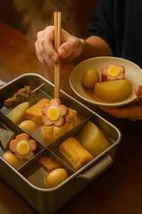 そろそろ、あの季節がやってきたからにゃ。そう、おでんの季節にゃ。秋の風が吹き始めると、どこからともなく漂ってくる、あの出汁の香り。鼻先をくすぐるその匂いに、吾輩のしっぽがぴくりと反応する。これはもう、ただ事ではないにゃ。※画像はAIによる生成(Copilot使用)人間どもは「肌寒くなってきたね」なんて言いながら、鍋を囲む。ふうふうと息を吹きかけ、湯気の向こうで笑い合う。その中心にあるのが、おでんという名の魔法の鍋。具材たちがぐつぐつと踊り、出汁の中で物語を紡いでいる。吾輩はその香りに誘われて、縁側からそっと覗き込む。ああ、あれはまさに、猫の心をくすぐる宴にゃ。世間では、大根、卵、こんにゃく、しらたきが定番とされているけれど、吾輩は知っている。おでんの世界は、もっと広くて、もっと深くて、もっと踊れるにゃ。今日はその中でも、ちょっと変わり種、でも実力派の具材たちを紹介するにゃ。まずは、牛すじ。ホルモン系の王様にゃ。見た目はちょっとゴツいけど、煮込まれるとぷるぷると震えて、まるで子猫の肉球みたいに柔らかくなる。噛めば噛むほど、じゅわっと旨みが広がって、出汁に深みを与える。まるで、鍋の底から響くベース音のように、全体を支える存在にゃ。主役じゃないけど、いないと寂しい。そんな存在、猫的にはとても好感度高いにゃ。次に登場するのは、桜うずら巻き。これはもう、見た目からして反則にゃ。ピンク色の魚肉シートに、まんまるのうずらの卵がくるまれてる。まるで春の花が咲いたような華やかさ。口に入れると、ぷちっと弾ける黄身の甘みが、魚肉の優しい塩気と混ざって、猫の舌が思わずくるくる回るにゃ。見た目で油断してると、味でノックアウトされる。そんな小悪魔的存在にゃ。イワシつみれは、庶民派のスターにゃ。骨ごとすり潰されたイワシが、ふわっと丸くなって登場。出汁を吸って、じゅわっと広がる魚の旨み。猫的には、魚の香りがたまらんにゃ。しかも、骨のカルシウムまでいただける。健康志向の猫にはぴったりにゃ。ちょっと地味だけど、実力派。アイドルより演歌歌手って感じにゃ。しかも、煮込むほどに味が染みて、まるで人生の深みを感じるにゃ。餃子巻きは、練り物界の革命児にゃ。魚肉シートに餃子が包まれてるって、誰が考えたにゃ?中華と和の融合。まるで異文化交流にゃ。皮のもちもち感と、餡のジューシーさが、出汁と絡んで、口の中でパーティーが始まるにゃ。ごぼう天は、根菜の力を見せつけるにゃ。ごぼうの香りが、魚肉の甘みと合わさって、鼻から抜ける風味がたまらん。シャキシャキ感も残ってて、食感が楽しいにゃ。しかも、出汁を吸うと、魚肉部分がふわっと膨らんで、まるで風船みたい。うどん巾着は、逆うどんとでも言うべき存在にゃ。油揚げの中に、煮込み用うどんと椎茸が詰まってる。普通はうどんの上に具材が乗るけど、これは具材の中にうどんがいる。逆転の発想にゃ。しかも、出汁を吸った油揚げが、うどんと椎茸の旨みを閉じ込めて、口の中でじゅわっと広がる。※画像はAIによる生成(Copilot使用)たまご巾着は、油揚げの中に生卵を入れて煮込むという、ちょっと危険な技にゃ。火加減を間違えると、卵が爆発する。でも、うまく煮込めば、半熟の黄身がとろりと出てくる。それが油揚げと絡んで、出汁と混ざって、口の中が温泉になるにゃ。ロールキャベツは、洋風の風を吹かせるにゃ。キャベツに包まれたひき肉が、出汁の中でじっくり煮込まれて、柔らかくなる。洋食なのに、和の出汁で煮ると、なんとも言えない優しさが生まれる。猫的には、キャベツの甘みが好き。肉の旨みと合わさって、まるで子守唄みたいな味にゃ。そして、しめはやっぱり、しらたき、こんにゃく、じゃがいも、大根にゃ。これがないと、おでんじゃない。しらたきは、踊るような食感。こんにゃくは、ぷるぷるのリズム。じゃがいもは、ほくほくのビート。大根は、じゅわっと染みるメロディー。全部揃って、ようやくおでんのフルオーケストラが完成するにゃ。吾輩は猫である。おでんの季節が来ると、心が躍る。具材たちが鍋の中で踊ってる。人間どもが笑ってる。猫も笑ってる。そんな夜が好きにゃ。湯気の向こうに見えるのは、ただの
