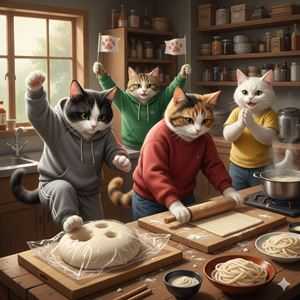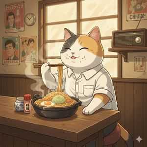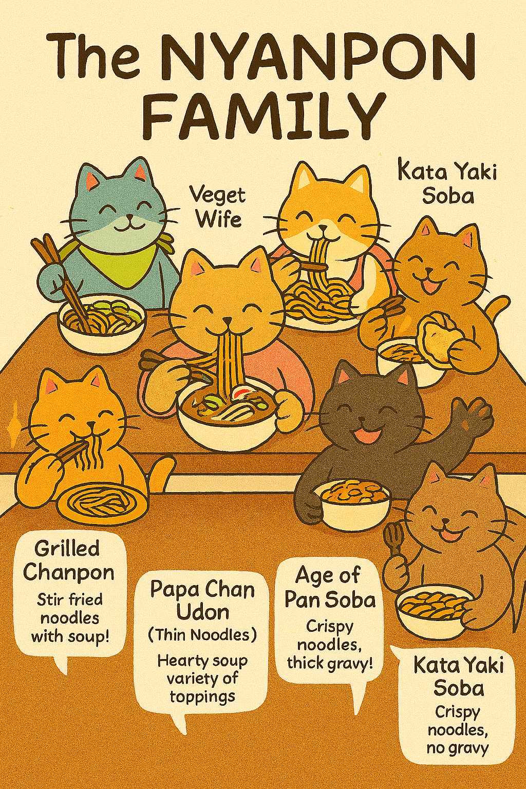 ちゃんぽん、皿うどん(細麺・太麺)、焼きちゃんぽん、あんかけやきそば、語焼きそばは、どうちがうの?調べていたら、野菜ラーメンも加えると、麺の違い(ちゃんぽん麺、中華麺の違い?)、とろみのあるなし等....似たり寄ったりで家族みたいと思って脱線してしまいました。少し、ストリー仕立てで、にゃんぽん一家という感じで、それぞれの特徴を紹介しますので、それとなく考えてもらえば....ここは長崎町の「にゃんぽん一家」のおうちにゃ夕ごはんを食べ終えて、みんなでリビングに集まって、テレビを見ながらゴロゴロしてるにゃ〜🐾 テレビでは「ご当地グルメ特集」が流れてるにゃ。にゃんぽん一家、ついに画面に登場にゃ!にゃんぽん一家は長崎町のほのぼのグルメ一家。それぞれが自分の名前の料理を食べながら、個性豊かに暮らしているにゃ。ポスターでは7匹全員が揃って、にゃかよく紹介されてるにゃ〜。★パパちゃんぽんは太麺と具だくさんスープが特徴。 包容力があって、家族をスープで包み込むような存在にゃ。 ちゃんぽんの原点として、みんなの味のベースになってるにゃ。★ママ皿うどん(細麺)は揚げた細麺にとろみ餡がかかった上品な一皿。 サクサクした食感と優しい笑顔で、出前文化を支えてきた女王にゃ。 ちゃんぽんとは違って、スープじゃなくて餡で勝負にゃ。★長男皿うどん(太麺)は炒めた太麺に餡をかけたしっかり者。 地域密着型で、汁なしでもちゃんぽん魂を受け継いでるにゃ。 炒めの香ばしさが魅力にゃ。★長男の嫁・野菜ラーメンは中華麺にシャキシャキ野菜たっぷりのあっさりスープ。 健康志向で、家族の体調管理を任されてるにゃ。ちゃんぽんよりも軽やかで、野菜の力で支えるにゃ。★長男の子・あんかけ焼きそばは焼き目のついた中華麺に餡がとろ〜り。 スタイリッシュで都会派、進化系の味を持ってるにゃ。ちゃんぽんとは違って、焼きと餡の融合がポインにゃ。★長女・焼きちゃんぽんは炒めた太麺に少量のスープ。 熱血系で香ばしさ命、炒めこそがちゃんぽんの真髄だと信じてるにゃ。 スープは控えめだけど、火力で勝負にゃ。★末っ子・かた焼きそばは揚げた中華麺に餡がかかったパリパリ元気っ子。 姉弟のいいとこ取りで、揚げの食感と餡のとろみを両立してるにゃ。 ちゃんぽんとは違って、パリッとした驚きがあるにゃ。---2025年10月18日(土)----- 長崎町・にゃんぽん一家のリビングにて 夕ごはんを食べ終えたあと、にゃんぽん一家はいつものようにリビングに集まって、にゃかよく団欒の時間にゃ。 今日は「パスタの日」ってことで、テレビでは全国のご当地麺特集が流れていて、みんなでソファに座ってわいわい見てたにゃ。 画面に映ったのは、なんと…わたしたち、にゃんぽん一家にゃ! ★パパちゃんぽんは、湯気の立つスープをすすりながら「やっぱりスープが命にゃ」とにっこり。 その表情は、家族を包み込むようなあったかさに満ちてたにゃ。 ★ママ皿うどん(細麺)は「パリッと揚げた麺に餡がとろ〜り…これが長崎の出前の味にゃ」と、目を細めてうっとりしてたにゃ。 昔の出前時代を思い出してるみたいだったにゃ。 ★長女やきちゃんぽんは「炒めこそ魂にゃ!」と、テレビに向かって拳を振り上げてたにゃ。 火力命の彼女は、今日も熱くて元気いっぱいにゃ。 末っ子かたやきそばは「パリパリが正義にゃ〜!」と、ソファの上で跳ねながら、揚げ麺の音を自慢してたにゃ。 その元気さに、みんな思わず笑ってしまったにゃ。 ★長男皿うどん(太麺)は「汁なしでも、ちゃんぽん魂は生きてるにゃ」と、真面目な顔で語ってたけど、 その横で、嫁の野菜ラーメンは「みんな脂っこいにゃ〜。私は野菜で家族を守るにゃ」と、そっとお茶を差し出してくれたにゃ。 彼女の優しさは、いつも家族の胃袋と心を癒してくれるにゃ。 ★そして、長男の子・あんかけ焼きそば坊は「焼き目と餡の融合…それが今のトレンドにゃ」と、スマホで自撮りしながらSNSに投稿してたにゃ。 都会派の彼は、いつも最新グルメ情報にアンテナを張ってるにゃ。 みんな違って、みんなうまい。 にゃんぽん一家は今日も元気に、長崎の味を囲んで笑ってたにゃ。 夕ごはんも終わって、にゃんぽん一家はリビングでゴロゴロ団欒中。 テレビではご当地麺特集が流れていて、みんなそれぞれの料理を食べながら、にゃかよく笑ってたにゃ。 そこへ、玄関の方から「ただいまにゃ〜」と元気な声が。 遅れて帰ってきたのは、長女・焼きちゃんぽんと末っ子・かた焼きそばにゃ。 学校の部活と、商店街のイベントでちょっと遅くなったらしいにゃ。 ★焼きちゃんぽんは、制服のまま炒め香る袋を抱えて「今日の調理実習、炒め技で先生に褒められたにゃ!」と誇らしげ。 「火力の使い方、ちゃんぽん魂で乗り切ったにゃ!」って、目がキラキラしてたにゃ。 ★かた焼きそばは、商店街の屋台で手伝いしてきたらしく「揚げ麺、パリパリに揚げるの難しいにゃ〜」と、ちょっと疲