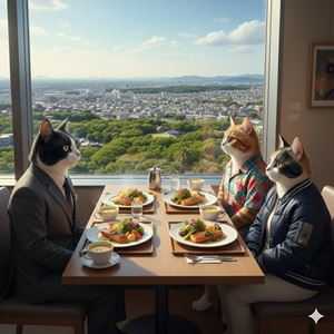 まずは、北九州市立美術館からスタートにゃ。白い壁が印象的な建物は、丘の上に静かにたたずんでいて、それ自体がもうアートだにゃ。中に入ると、ゆったりとした空間で、いろんな時代の作品と静かに向き合えたにゃ。展示室を歩きながら、頭の中がすっきりしていくのを感じるにゃ。たっぷりアートを堪能したら、いよいよお昼ごはんにゃ。北九州市美術館の2階にある「カフェ・ミュゼ」へにゃ。ここは本当に、秘密のにゃんこの隠れ家みたいだにゃ。窓際の席に案内してもらって、思わず「にゃーん」と声が出そうになったにゃ。目の前に広がるのは、緑の木々の向こうにきらめく響灘と、北九州の街並みにゃ。高台だからこその、特別な景色だにゃ。視界の良い日は下関市や関門橋まで見えるにゃ。もし、人気の窓際の席がもし埋まっていても、落ち込む必要はないにゃん。なぜなら、このカフェはどの窓からも景色が楽しめるように設計されているからだにゃ。もし、正面の窓からは響灘と北九州の街並みが見渡せる大パノラマが見える席に先客がたくさんいたとしても、大丈夫にゃ。反対側の窓に目を向けてみると、そこには豊かな緑が広がっているにゃ。光が差し込む静かな空間で、新緑や木々の葉を眺めながら食事をするのは、まるで山小屋で森林浴をしているみたいな気分になれるにゃん。どの席に座っても、アートと自然に囲まれた、特別な時間が流れているにゃ。注文したのは、今月のおすすめプレートにゃ。彩り豊かなお料理が並んで、見た目も美しいにゃ。特に、添えられていた温かいスープが、ほっこり体に染みたにゃ。アート鑑賞で使った頭と心を、この静かで美しい景色と美味しいお料理が優しく癒してくれるにゃ。窓の外の景色は、時間と共に光の加減が変わって、ずっと見ていたくなるにゃん。お腹いっぱいになったら、次は歴史と生命の旅へにゃ。車を走らせて、「北九州市立いのちのたび博物館」に到着にゃ。ここはまるでタイムマシーンだにゃ。巨大な恐竜の骨格標本が目の前に現れたときは、にゃんすけも思わず立ちすくんだにゃ。その迫力たるや、すごいの一言にゃ。地球の誕生から、生命の進化、そして北九州の歴史まで、広い館内を歩き回りながら、いろんな知識を吸収したにゃ。特に動く恐竜の模型とか、細部まで再現されたジオラマは、にゃんこの好奇心をくすぐるにゃ。時間を忘れて夢中になってしまったにゃん。たっぷり学んだ後は、今日のハイライトにゃ。「皿倉山」へ向かうにゃ。新日本三大夜景の一つに選ばれている絶景スポットだにゃ。ケーブルカーとスロープカーを乗り継いで、山頂を目指すにゃ。どんどん高くなるにつれて、街が小さくなっていくのが楽しいにゃ。そして山頂に到着にゃ。日が傾き始めて、空がオレンジ色から深い青色に変わっていく、マジックアワーだにゃ。この時間帯の景色は、本当に息をのむ美しさだにゃ。今日の締めくくりは、山頂の展望台にある「レストラン 天宮(TEN・KYU)」で、晩ごはんにゃ。窓際の特等席をゲットにゃ。目の前には、宝石をちりばめたような北九州の「100億ドルの夜景」が広がっているにゃ。きらめく工場の灯りや、街の明かりが、まるで生きているみたいに輝いているにゃ。こんなロマンチックな場所でごはんを食べるなんて、最高にゃ贅沢だにゃ。注文したのは、夜景にぴったりのちょっと豪華なメニューにゃ。上品で繊細なお料理の数々は、五感を満足させてくれるにゃ。温かいお料理をいただきながら、窓の外の夜景をじっと眺めていると、今日一日巡った北九州の景色や文化が、すべてこの輝きの中に詰まっているように感じたにゃ。このレストランは、ただごはんを食べる場所じゃなくて、景色と食事が一つになった、特別なガストロノミー体験をさせてくれるにゃ。お腹も心も満たされて、大満足で下山にゃ。北九州の旅は、アートと歴史、そして美味しい絶景グルメの組み合わせで、忘れられない思い出になったにゃ。またすぐに、北九州紀行を楽しみたいにゃん。※施設は時期により営業時間が異なりますので、事前に確認して下さいね。