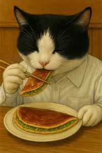 もう閉店してしまった若松の、三十年前に食べたという幻の一銭洋食。別名べた焼きを追体験してきたにゃ。これがまた、とーってもシンプルなのに、奥深い味で、思い出の味をさらに超える感動だったにゃあ。※画像はAIによる生成(Copilot使用)べた焼きっていうのはね、昔はお金があんまりなくても一銭で食べられたっていう、庶民の味のルーツにゃんだって。にゃので、べた焼きでなく、一銭洋食という所もあるにゃ。お好み焼きの先輩みたいなものだにゃ。鉄板に、水で溶いた小麦粉を薄く、べたっと広げるにゃ。そこに具材をのせて、半分にパタンと折って焼くのが特徴だにゃん。生地は薄くてモチモチにゃ。端っこはカリッとしてるにゃあ。一口食べると、香ばしい生地の中から、焼けて甘みを増したシャキシャキのネギが口いっぱいに広がるんだにゃ。そのネギの量が尋常じゃないにゃ!まさにネギまみれ、ネギの絨毯を食べているみたいだにゃ。こんなにネギが美味しいなんて、今まで知らなかったにゃ。まさにネギのポテンシャルを最大限に引き出した逸品にゃん。※画像はAIによる生成(Copilot使用)地味だけど、旨味の決め手はトロロ昆布と魚粉にゃ!これが大事なんだにゃ。ネギの甘みと、トロロ昆布の優しい海の香りが絶妙に絡み合って、口の中で新しいハーモニーを奏でるんだにゃ。ああ、これが若松で愛された味の秘密だったのか、と納得したにゃん。旨味がググッとアップして、香ばしい磯の香りがたまらにゃい。特に、たっぷりかかったソースがたまらにゃい。甘辛いソースが、素朴な生地とネギ、そして隠し味の旨味成分に絡みついて、もうペロリにゃん。このソースがまた、子供の頃の縁日の味を思い出させるんだにゃ。どこか懐かしくて、でも新しくて、一口食べるごとに「美味しい!」ってしっぽがフリフリ止まらないにゃ。見た目はシンプルだけど、なんだか懐かしい味がするにゃ。豪華な具材はいらないにゃん。こういう飾らない味が、一番ホッとするんだにゃー。みんなも、昔ながらの日本の味、ぜひ試してみてにゃん。それじゃ、また次のニャルポでお会いするにゃん。バイバイにゃ。