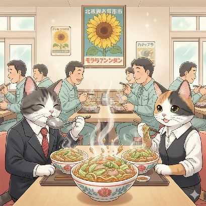 1.北九州のソウルフードにゃ!(1)あの頃の美味しさが忘れられないにゃ 1)味噌チャンポンって、どんな味にゃ? 北九州市の味噌チャンポンって聞くと、お腹がグーって鳴っちゃうにゃ。 特に昔ながらの食堂で出されていた一杯は、それはそれは格別の美味しさだったのにゃ。 味噌スープの深いコクと、ラードで炒めたシャキシャキの野菜から出る甘みが、絶妙に絡み合っていたのにゃ。 ああ、たまらないにゃ!ただ味噌の味が濃いだけじゃなくて、野菜や豚肉の旨味がぎゅっと詰まっていて、一口飲むと「あぁ、これこれ!」ってなる、まろやかで優しい味だったにゃ。 ガテン系の男の人たちを支えてきた、エネルギッシュな味でもあったのにゃ。 2)忘れられない詳細と思い出にゃ にゃんと、「懐かしの味噌チャンポン」って言ったら、多くの人が北九州市役所にある地下食堂の味噌チャンポンを思い出すにゃ。 ああ、地下食堂が閉店しちゃったのは本当に寂しいにゃ。 あの食堂の雰囲気がもう、たまらなかったのにゃ。 ちょっとレトロで、どこか懐かしい、昭和の香りがプンプンする場所だったにゃ。 市役所の職員さんたちや、用事を済ませに来た市民さんたちでいつも賑わっていたにゃ。※画像はAIによる生成(Copilot使用) そこで出される味噌チャンポンは、とにかくリーズナブルでボリューム満点だったのにゃ。 熱々のスープに、キャベツやもやしが山盛り。 その上にちょこんと乗った豚肉がまたいい味を出してたのにゃ。 うーん、想像するだけで涎が出ちゃうにゃ!冬の寒い日にあの味噌チャンポンを食べると、体の芯から温まって、「ああ、生きててよかったにゃ」って心底思ったものにゃ。 お昼休憩の短い時間でも、サッと出てきて、ガツガツ食べられる。まさに市民の胃袋と時間を守ってくれていた、ヒーローみたいな存在だったにゃ。 でもね、なんであんなに美味しかったんだろうにゃ? きっと、お店の人たちの愛情と、長年使い込まれた寸胴鍋の味が染み込んでいたからにゃ。 ああ、もう一度あの味噌チャンポンを食べたいにゃ...って、しんみりしすぎかにゃ?(2)味噌チャンポンと味噌ラーメン、似ているけど違うにゃ 1)味噌ラーメンとの決定的な違いにゃ 「味噌チャンポンって、要するに味噌ラーメンに野菜がいっぱい入ったものでしょ?」ってよく聞かれるけど、にゃんにゃん! それは違うにゃ!確かに見た目は似ているけど、決定的な違いがあるのにゃ。 ①スープの深みが違うにゃ 味噌ラーメンは、味噌ダレを豚骨や鶏ガラのスープで割るのが一般的だけど、北九州の味噌チャンポンは、ちゃんぽん特有の調理法が活きているにゃ。 それは、野菜や肉をラードで炒めてから、スープと合わせるというひと手間にゃ。 このひと手間が、炒めた具材の香ばしさ、旨味、甘みをスープに溶け込ませて、普通の味噌ラーメンでは出せない、複雑で深いコクを生み出しているのにゃ。 味噌の風味だけじゃなくて、野菜の力がすごく出ているにゃ。 ②麺の絡みが違うにゃ 使われる麺も違うにゃ。 味噌ラーメンはちぢれ麺が多いけど、北九州の味噌チャンポンは、ちゃんぽん麺、またはそれに近い中太麺が使われることが多かったにゃ。 濃厚な味噌スープと炒め野菜の旨味をしっかり受け止められる、力強い麺が求められていたのにゃ。 ああ、あの麺とスープを一緒にずるずるっとすすりたいにゃ!(3)秋田の味噌チャンポンとは全然違うにゃ※画像はAIによる生成(Copilot使用) 1)北九州と秋田の味噌チャンポンの簡素な違いにゃ 秋田にも「味噌チャンポン」があるけど、北九州のものとはまるで別物なのにゃん! 北九州の味噌チャンポンは、とろみがないスープで、ラーメンや普通のちゃんぽんに近い形態だったにゃ。 昔ながらの食堂の、庶民的でスタミナ満点の味だったのにゃ。 一方、秋田の味噌チャンポンは、強いとろみのあるあんかけ状のスープが最大の特徴にゃ。 具材もあんかけに閉じ込められていて、寒い秋田で冷めないように工夫された、地域独自の形態にゃ。 全然違う料理だと思った方が良いにゃ。 北九州のは、ラーメンとちゃんぽんが融合したような感じ。 秋田のは、中華のあんかけ麺の仲間って感じかにゃ。2.消えゆく懐かしの味を惜しむにゃ北九州の味噌チャンポンは、玉屋食堂が閉店してしまったように、今、その姿を減らしつつあるにゃ。それはまるで、北九州の昭和の歴史や、製鉄マンたちが生きた時代の記憶が、一つ一つ消えていくみたいで、にゃんとも寂しい気持ちになるにゃ。ああ、でもね、諦めないにゃ!あの懐かしい味噌チャンポンを愛する人は、まだまだ北九州にいるにゃ!役所の地下食堂の味はもう二度と食べられないかもしれないけど、北九州市内には、その味を受け継いでいるお店や、独自の味噌チャンポンを提供しているお店がまだ残っているにゃ。例えば、コチジャンが入ってピリ辛な味噌チャンポン等の個性的な「味噌チャンポン」を守り続けているお店があるのにゃ。私たちは