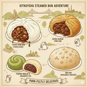 お外は少し肌寒いけど、心はホカホカにゃ。北九州には、大陸の風を感じる異国の味と、山里の恵みを感じる素朴な味が両方残っているんだにゃん。★★揚子江の豚まんまずは小倉の老舗、揚子江の豚まんにゃ!わあ、手のひらいっぱいにゃ、ずっしりとした重みを感じるにゃん。低温発酵させたという生地は、モチモチとフワフワのバランスが絶妙にゃ。これぞ匠の技、って感じにゃ。さあ、一口かじってみるにゃ。じゅわー!って、肉汁があふれてくるにゃん。あちち、お肉の旨みと、たっぷりの玉ねぎから出た優しい甘みが口の中いっぱいに広がるにゃん。味付けは比較的さっぱりしているから、この大きな豚まんでも、もう一個ペロリといけそうな気がするにゃ。この溢れる肉汁をこぼさないように食べるのが、北九州の旅人の試練にゃ。にゃフフ、至福のひとときにゃ。★★平和會館の豚まんお次は、同じく小倉の老舗、平和會館の豚まんにゃ。揚子江と並び称されるだけあって、こちらも負けず劣らず大きいにゃん。直径12センチくらいあるかにゃ?皮は、揚子江よりもさらにモッチモチで、噛み応えがあるにゃん。一口食べると、餡がまた個性的にゃ。しっかりとした濃いめの味付けで、豚肉と玉ねぎがゴロゴロ入っているにゃ。胡椒がピリッと効いていて、ガツンと食べ応えを求める食いしん坊にはたまらない味にゃ。お店の方が、「まんとう(具なしの蒸しパン)」も美味しいよって教えてくれたにゃ。豚まんと共に、大陸から伝わった素朴な味を受け継いでいるんだにゃんね。★★よもぎ饅頭と芋饅頭(おかもと屋)お腹いっぱいになったけど、デザートは別腹にゃん。おかもと屋さんのよもぎ饅頭と芋饅頭をいただくにゃ。まずよもぎ饅頭にゃ。袋を開けた瞬間、ふわーっと、春の野原のようなよもぎのいい香りが広がるにゃ。この蒸し饅頭の皮は、ふっくらもっちりにゃ。中には甘すぎない、上品な粒あんがたっぷりにゃん。そして芋饅頭!こちらはねっとりしたサツマイモの甘みが凝縮されていて、昔ながらの素朴な甘さが心に染みるにゃ。この飾らない、手作りの味が、地元で長く愛される理由にゃんね。★★いもパン(若松えびす堂)最後に、若松のレトロな街で見つけた、若松えびす堂のいもパンにゃ。「いもパン」って名前だけど、これは紛れもない「万十」にゃ。小麦粉と重曹でふっくらと蒸し上げられた、ほのかな甘さの生地にゃ。わあ!探していたサイコロ状のサツマイモが、あちこちに散りばめられているにゃん!ホクホクした芋の食感と、素朴で優しい甘さの蒸しパン生地の相性が最高にゃ。これこそ、おばあちゃんが作ってくれた、昔のおやつそのものの味にゃん!大昔の港町で、労働者たちに愛された、エネルギー源だったんだろうにゃんね。北九州の蒸し菓子の旅、大満足にゃん。ごちそうさまでした!