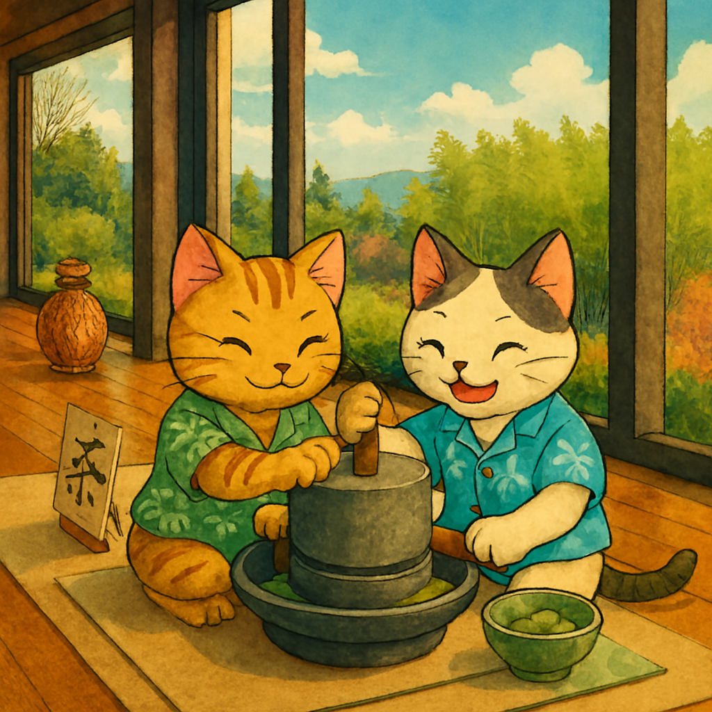 大きな石臼の前に座って、茶葉を一枚ずつ挽いていくにゃ。