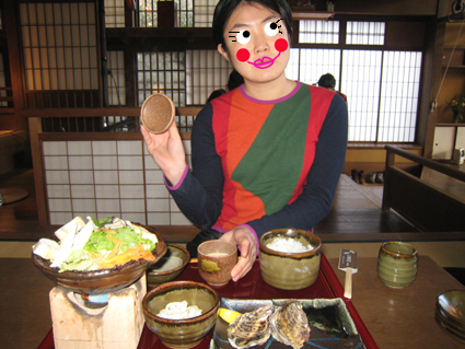 外宮参拝のあと、バスで内宮に。まだ10時だったけど、取りあえずお食事をと、入ったのが二軒茶屋が経営する牡蛎料理のお店。一昔前は内宮の周りは、「よくもまあこんなまずい物を食わせる店ばっかり並んでいる」と唸らせるような店ばっかしだったけど、今では赤福の浜田会長のおかげで、どの店も美味しくって、お洒落で、リーズナブルなお値段のお店ばかり。牡蛎フライ、焼き牡蛎、に大満足!