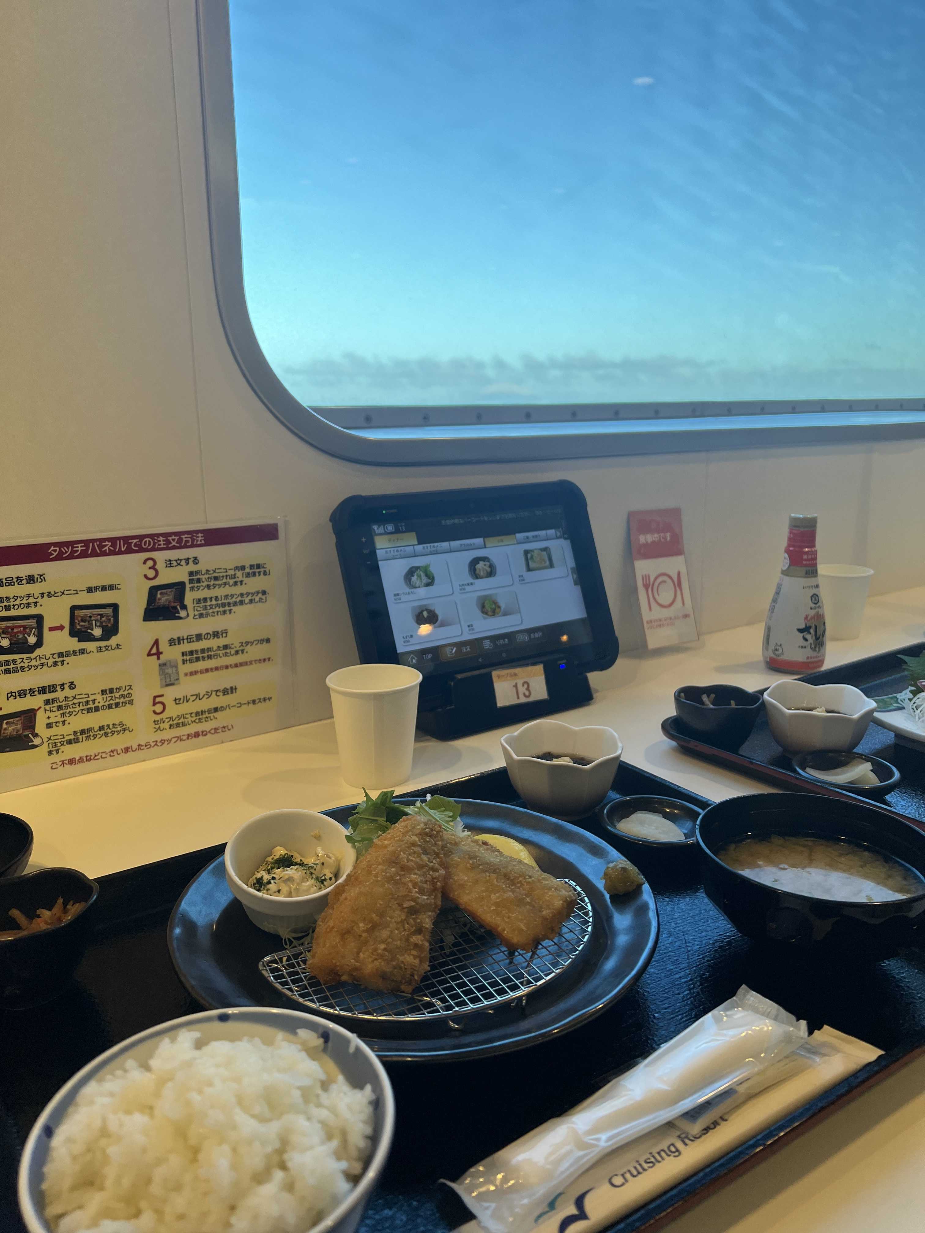 船の食事は、朝昼夜と時間が決まっていてそれ以外は食べられないの。