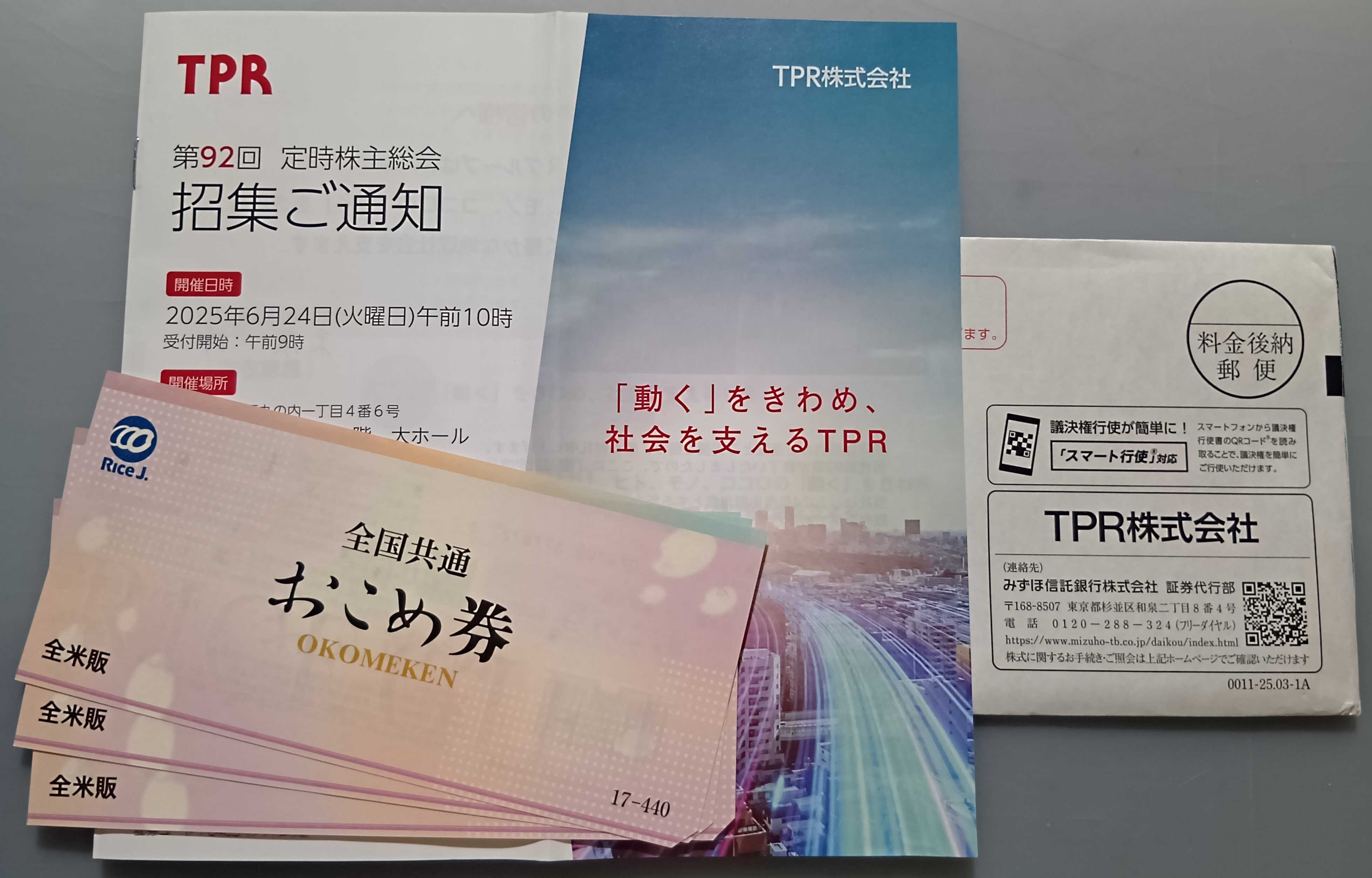 ◆TPRから株主優待のおこめ券3枚が届きました~!あれれ?これ1枚で1キロに交換できるのか440円として換算されるのかどちらでしょうか???