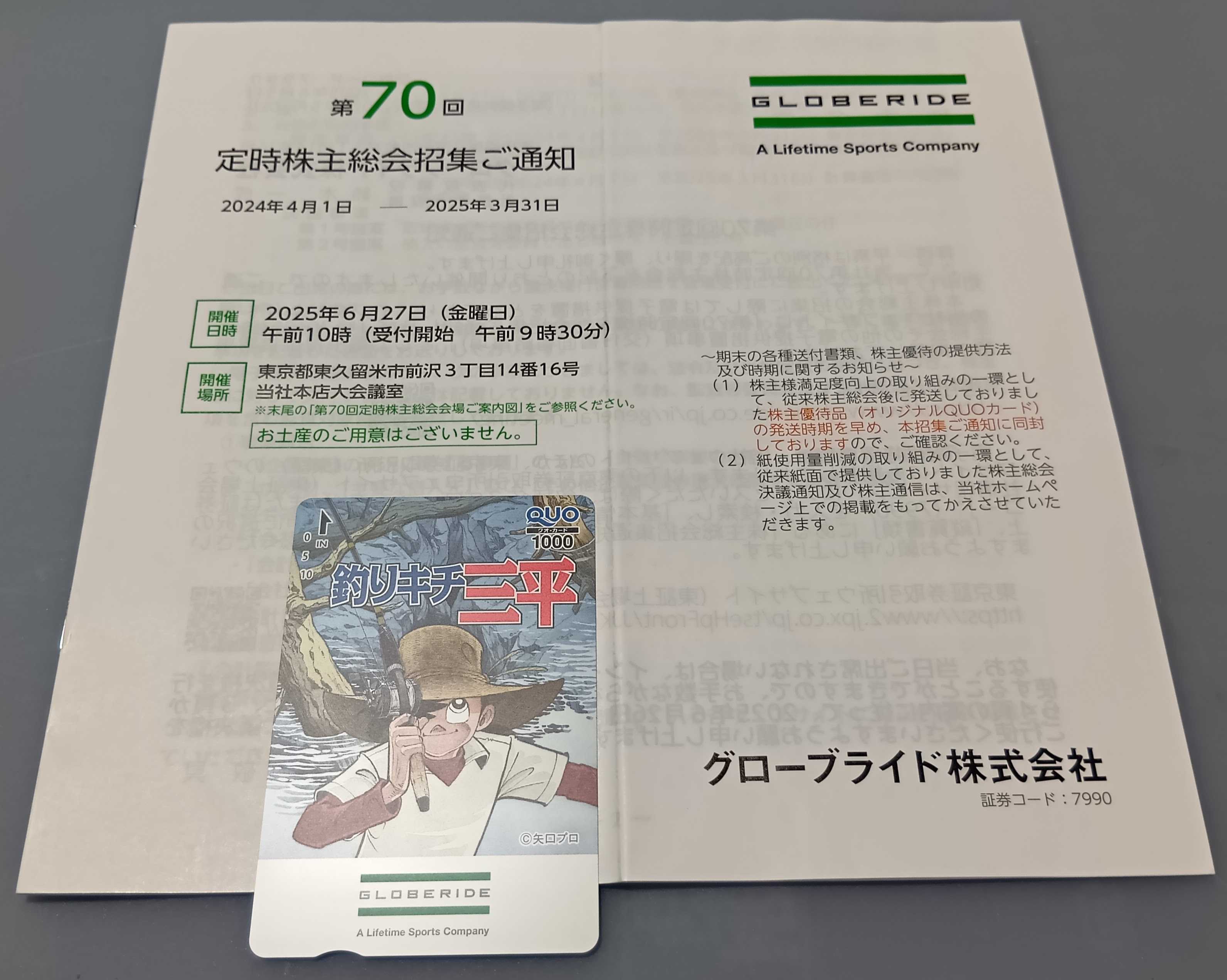 ◆グローブライドから株主優待のクオカード1,000円分が届きました~!「釣りキチ三平」って懐かしいマンガですよねですがコレクションせずにさっさとコンビニで使ってしまうと思います