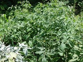 刈った草を置いてある場所に摘んだトマトの脇芽も捨ててあったのですが、その場所でトマトが根付き、花まで咲き始めていました。