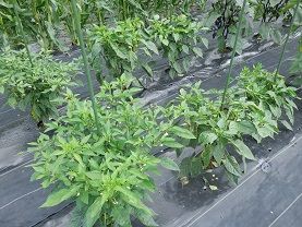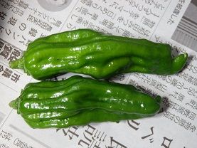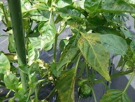 シシトウとピーマン、少しですが収穫できています。ピーマン(右)に枯葉が目立ち心配です。