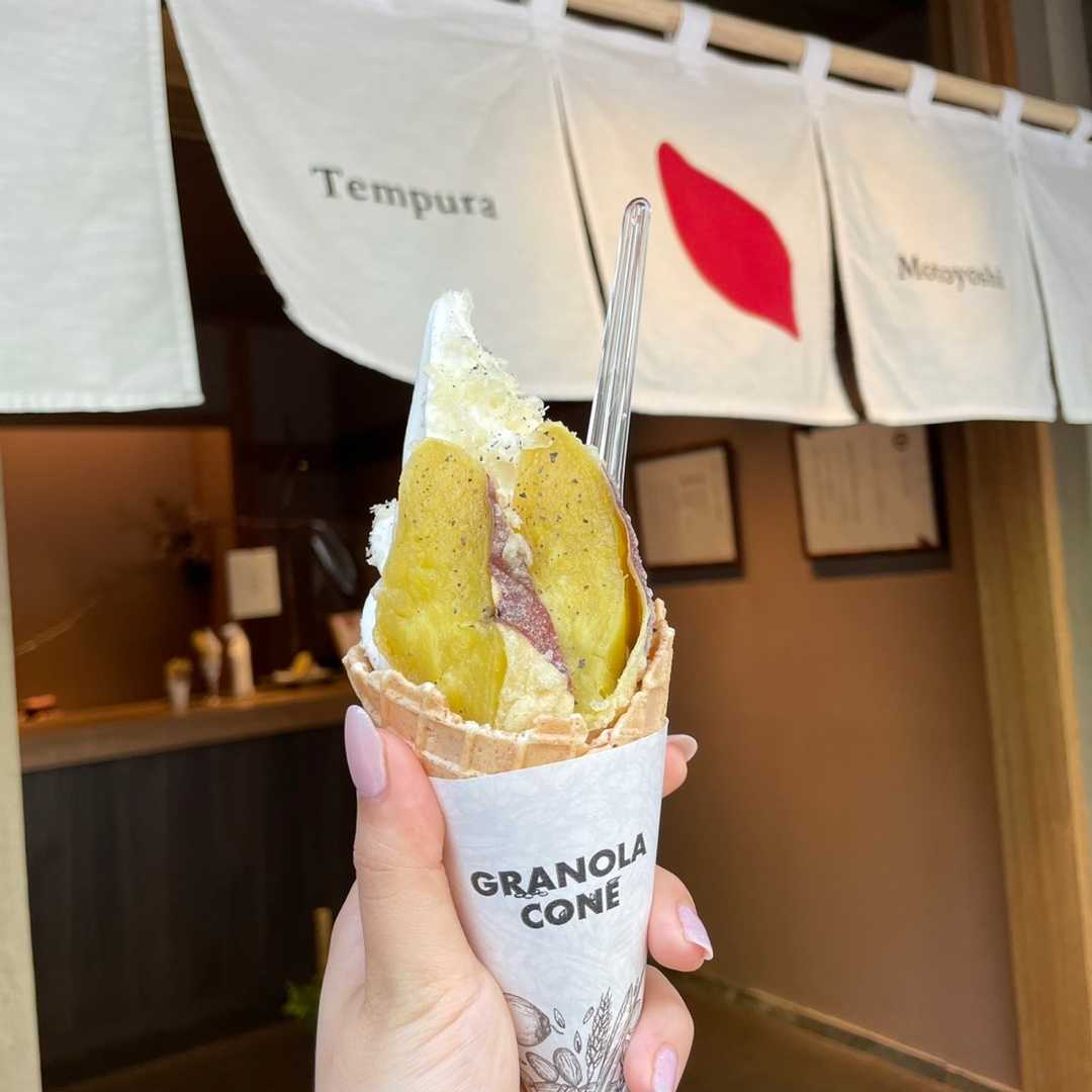 代官山で美味しいスイーツ発見! ソフトクリームと芋天の組み合わせが最高です。味も食感も申し分なし。 テイクアウトの芋天もあります〜