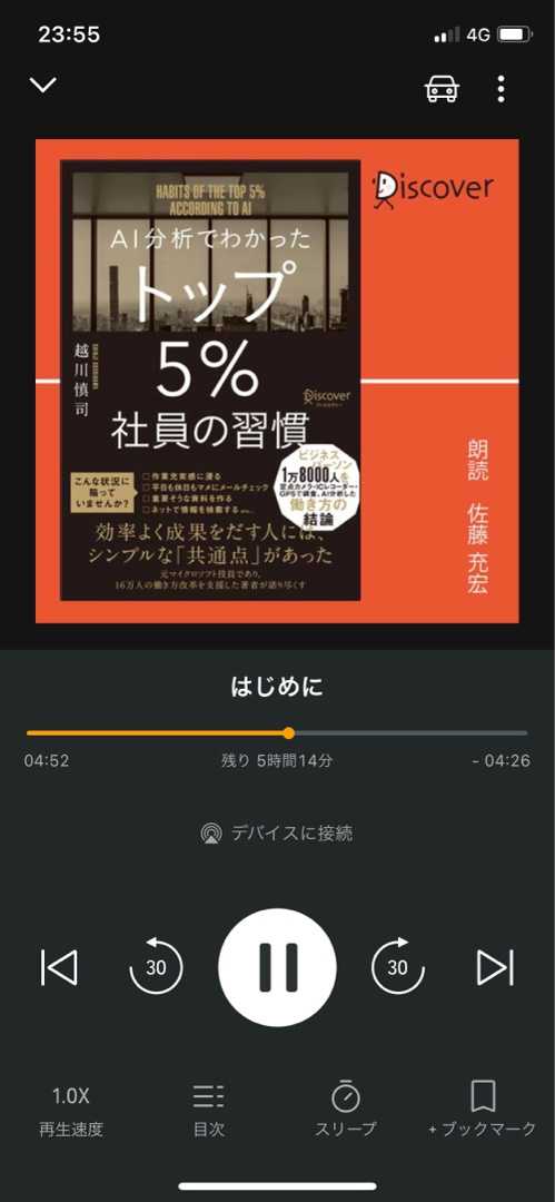 今回はAudibleで購入してみました。 この書籍、かなり参考になります。 日々通勤中に聞いて意識するようにしています。 AI分析でわかったトップ5%社員の習慣