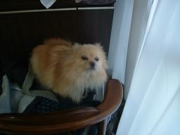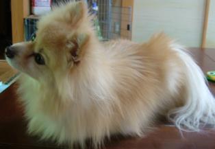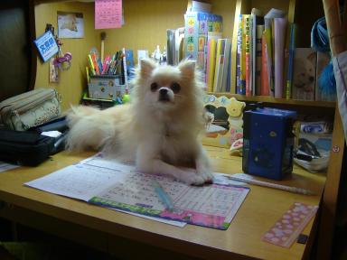ポロンちゃん、どうしても、机の上が見たい、見たいと、ねだるので狭い机を隅々まで匂いを嗅いだ後、満足げに座ったところです。「おもちゃがいっぱいでちね!」