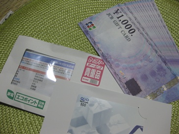 冷蔵庫を購入した時、申請したエコポイントの商品券が昨日届きました。申請書をポストに入れたのが2010年9月2日の朝だったので商品券到着まで約2か月かかりましたよ。グリーン家電普及促進事業エコポイントのHPにて申請状況確認はしていたのでもうそろそろ来るかな?とは思っていました。今回届いた商品券は冷蔵庫の購入エコポイントが9000点 とそれに伴い古い冷蔵庫のリサイクルが5000点 で合計14000点なんですが500点は送料になるので商品券は13000円と端数の500円はQUOカードでした。この商品券は次に購入予定の地デジ用テレビの一部になる予定です。先週末、今週末とテレビを選びに家電量販店に行ってきました。メーカーも種類も多いのでひとつに絞るのにまだ検討中ですが、なんとなくこれかな?と思える物が決まってきました。テレビの購入については、また次にお伝えしますね。