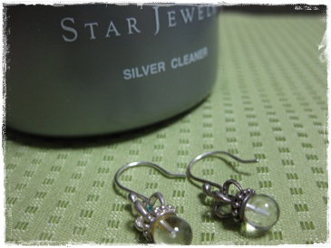 スタージュエリー のシルバークリーナーです。シルバー製品って使わないと逆に黒く変色してきますね。こちらのクリーナーは 液に浸して5~10秒でキレイに元のシルバー色に戻りますよ。ピアスの左はクリーナー済み右は変色したままです。見比べて差がわかりますね。お値段も 987円 でお手ごろですしアクセサリーをいつまでもキレイに大切に使う為にお手入として とても便利です。このピアスは友人からの大切なプレゼントなんです。ピアス穴を開けた記念に頂いた物です。たしか 大好きなレイジースーザンの物だと思います。