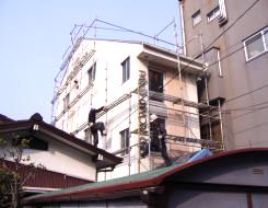 屋根工事のための足場工事です。この工事に限っては、総工費の1/3は足場工事費です。この足場を利用して外壁の塗装をという声もあったのですが絵に描いたようにはならない。株式会社小野建設 一級建築士事務所 onoken.net