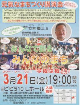 再度講演会のお知らせ 拡大ポスターを表示竹本慶三氏について周南市の活性化を願う仲間で竹本氏の講演会を企画された。「聞けば、きっと心が震える、燃え上がる方だそうだ。」わたしも楽しみにしています。株式会社小野建設 一級建築士事務所 onoken.net