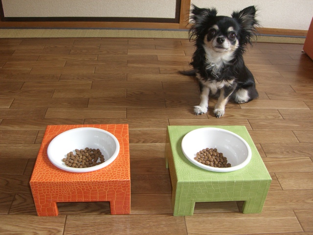 今まで使ってたのは1つのスタンドに2つのフードボールがついてるタイプだったのでご飯を食べるとき2匹並んで食べてるんだけど、2匹の間が近すぎてそのせいでお互いとられまい?と焦って食べてる感じがするので別々のスタンドが欲しかった。15日は給料日だし、先月は頑張って残業もしたので少し給料も上がってるだろうから思い切って気分転換に新しく購入したのが今日届いた~ウシシ。さっそくご飯!ご飯!あたしが購入したのでオレンジとグリーンは売り切れになったみたい。残りはピンクのみ。クロコダイル模様がいまいち気に入らなかったけど実物は思ったほど悪くなくかわいいしボウルがホーローってのがお気に入り