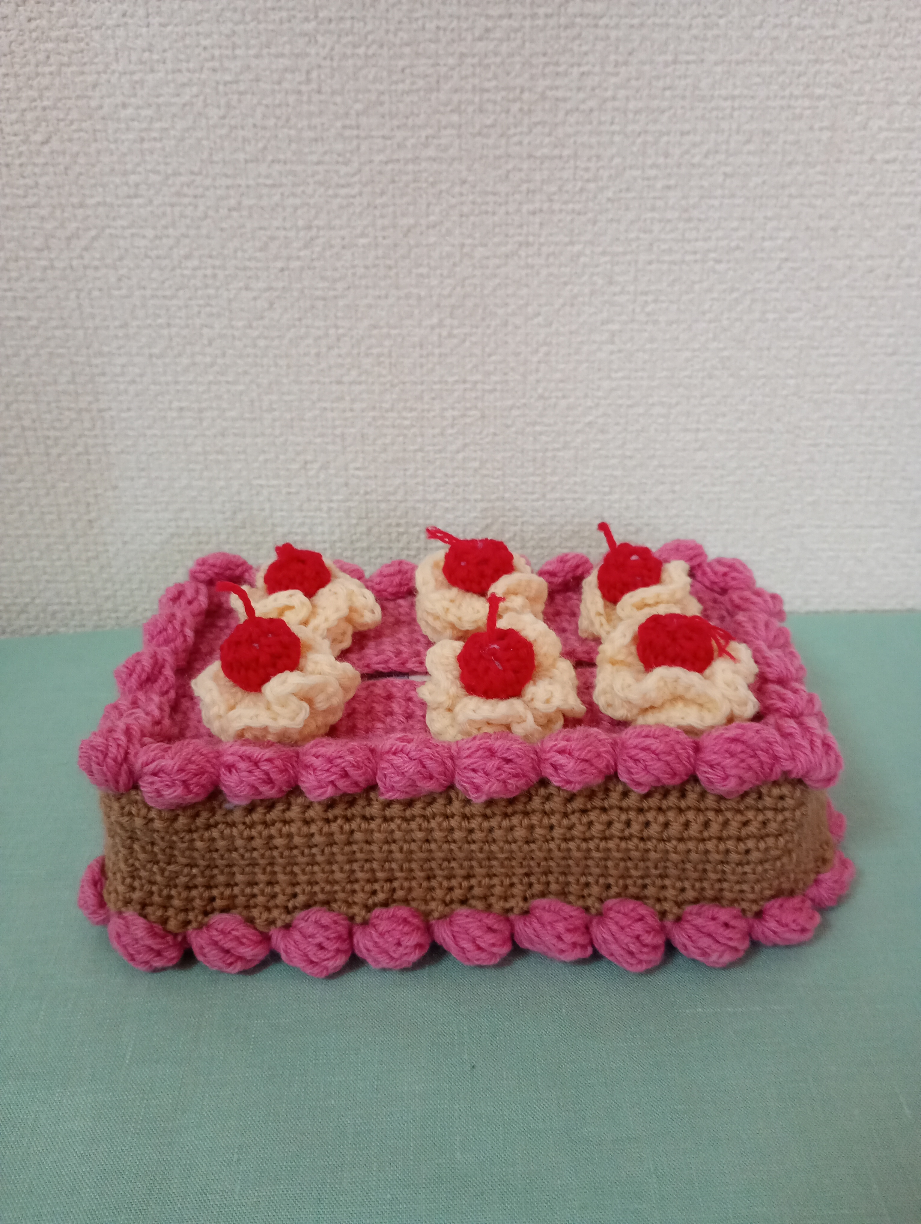 「まいにちのかぎ針編み」からさくらんぼのティッシュケーキを編みました!1つ目生クリームが編み図通りに編めていなかったりスポンジ部分(茶色のところ)の細編みの往復編みがよくわからず動画で教えてくれているのを探し、何度も見ながらなかなか難しかったです楽しさはありつつ♪やっと完成〜!と喜んだのも束の間うちのティッシュケースに入らず(´;ω;`)なのでちょっとずつ大きくして(目数を増やして)高さも調整してもう一つ編みました上から見るとこんな感じ毎日使っています(^O^)
