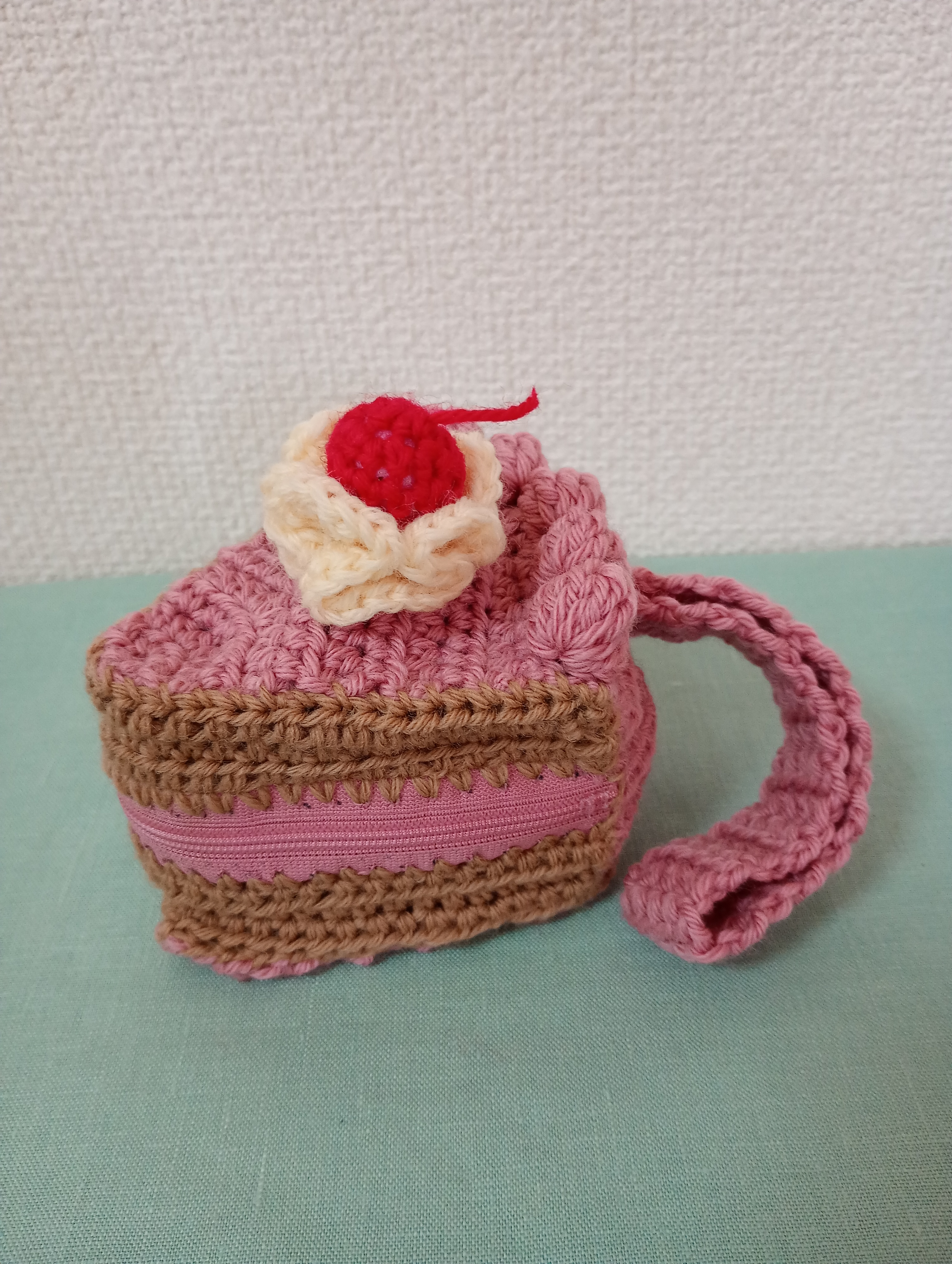 「まいにちのかぎ針編み」からさくらんぼのケーキポーチ編みました!スポンジの色を間違えていますでも、これもありかなとかわいいです!ただ、写真を撮るために中に紙をクシャクシャッとして形を保っています実際にカバンに入れて使うというよりお家の中で小物入れにする予定です(^O^)ファスナーにレース針を使って穴を空けてそこにかぎ針で編み込んでいくのが力が必要で手こずりましたできてみれば可愛くて疲れも吹っ飛びます(*´∀`*)他の本には無いデザインでワクワクします♪