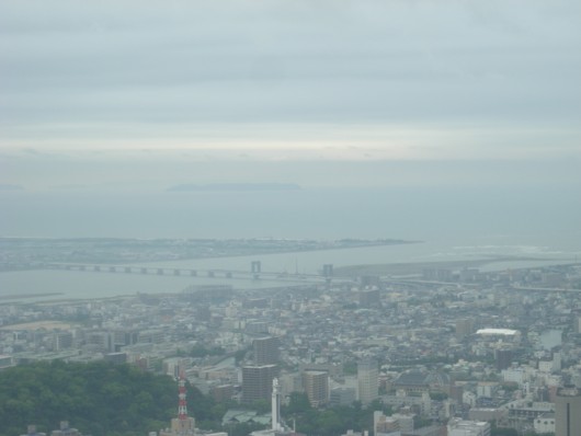 さて当日は、昼時に車で眉山の山頂に行き、腹が空いたので山上のレストランへ入った。展望の良い席に座って注文を済ませ、フト眼前の景色を眺めていると、遠方に細長い島が見えるではないか・・・。
