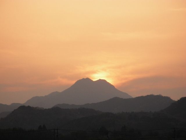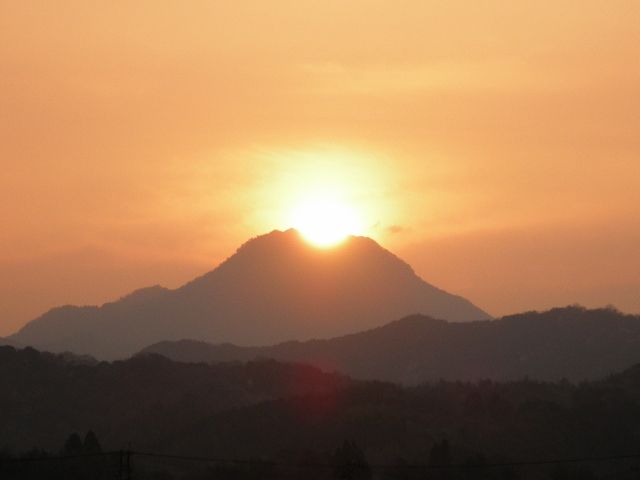 けれども・・・もしかすると・・・とも思いつつ高台の駐車場から車で降りてきて、ちょうど麓にある神社の鳥居前を通りかかった時に、その双耳峰の真ん中に太陽が降りていく荘厳な景色に遭遇!!!