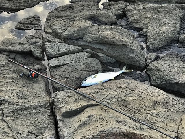 獲物との手慣れた対応を見せてもらった後に、岩場に釣れた魚と竿を置いたところを映した画像が上で、釣ったおじさんに魚種を聞くと「ひらす(ブリの子供)だよ、まだ小さい。」と言っていた。